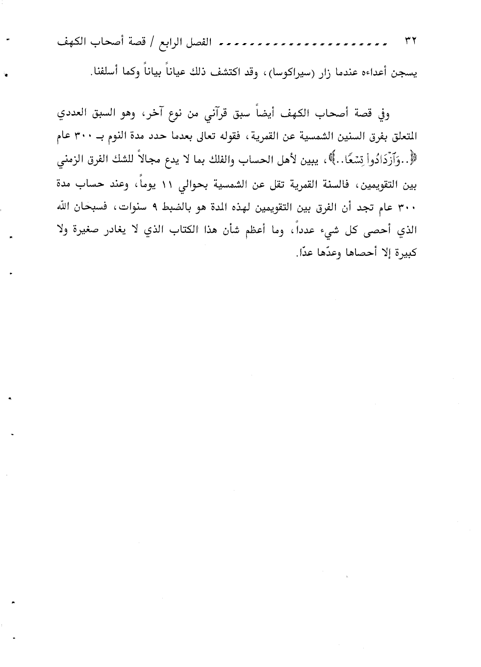 وفي قصة أصحاب الكهف أيضا سبق قرآني من نوع آخر، وهو السبق العددي المتعلق بفرق السنين الشمسية عن القمرية، فقوله تعالى بعد ما حدد مدة النوم ب 300 عام .. وازْدَادُوا تِسْعاً .. ، يبين لأهل الحساب والفلك بما لا يدع مجالا للشك الفرق الزمني بين التقويمين، فالسنة القمرية تقل عن الشمسية بحوالي 11 يوما، وعند حساب مدة 300 عام تجد أن الفرق بين التقويمين لهذه المدة هو بالضبط 9 سنوات، فسبحان اللّه الذي أحصى كل شيء عددا، وما أعظم شأن هذا الكتاب الذي لا يغادر صغيرة ولا كبيرة إلا أحصاها وعدّها عدّا.