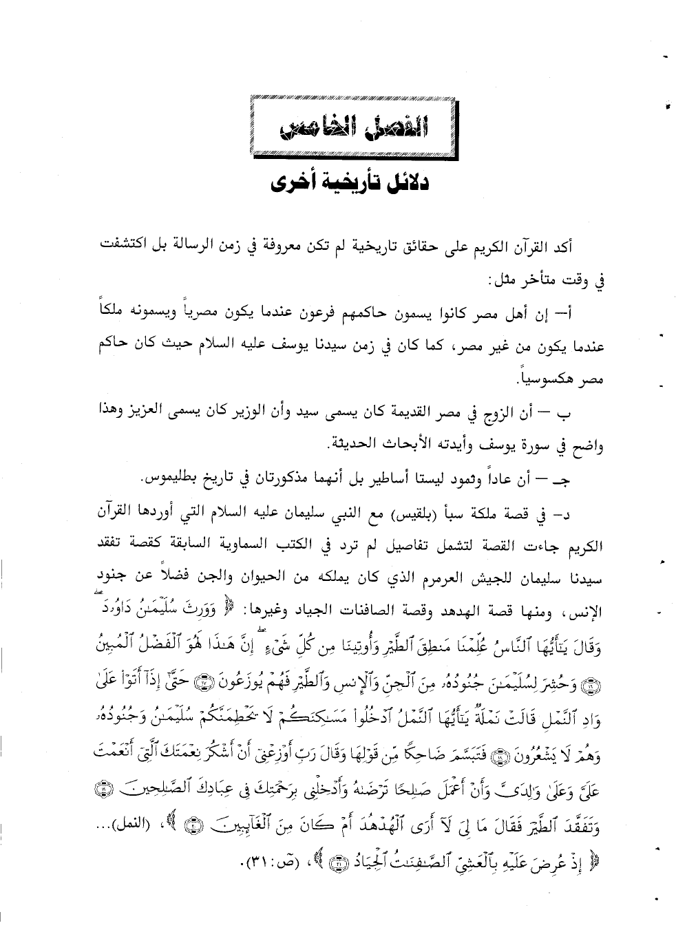 د - في قصة ملكة سبأ (بلقيس) مع النبي سليمان عليه السلام التي أوردها القرآن الكريم جاءت القصة لتشمل تفاصيل لم ترد في الكتب السماوية السابقة كقصة تفقد سيدنا سليمان للجيش العرمرم الذي كان يملكه من الحيوان والجن فضلا عن جنود الإنس، ومنها قصة الهدهد وقصة الصافنات الجياد وغيرها: ووَرِثَ سُلَيْمانُ داوُدَ وقالَ يا أَيُّهَا النَّاسُ عُلِّمْنا مَنْطِقَ الطَّيْرِ وأُوتِينا مِنْ كُلِّ شَيْءٍ إِنَّ هذا لَهُوَ الْفَضْلُ الْمُبِينُ (16) وحُشِرَ لِسُلَيْمانَ جُنُودُهُ مِنَ الْجِنِّ والْإِنْسِ والطَّيْرِ فَهُمْ يُوزَعُونَ (17) حَتَّى إِذا أَتَوْا عَلى وادِ النَّمْلِ قالَتْ نَمْلَةٌ يا أَيُّهَا النَّمْلُ ادْخُلُوا مَساكِنَكُمْ لا يَحْطِمَنَّكُمْ سُلَيْمانُ وجُنُودُهُ وهُمْ لا يَشْعُرُونَ (18) فَتَبَسَّمَ ضاحِكاً مِنْ قَوْلِها وقالَ رَبِّ أَوْزِعْنِي أَنْ أَشْكُرَ نِعْمَتَكَ الَّتِي أَنْعَمْتَ عَلَيَّ وعَلى والِدَيَّ وأَنْ أَعْمَلَ صالِحاً تَرْضاهُ وأَدْخِلْنِي بِرَحْمَتِكَ فِي عِبادِكَ الصَّالِحِينَ (19) وتَفَقَّدَ الطَّيْرَ فَقالَ ما لِيَ لا أَرَى الْهُدْهُدَ أَمْ كانَ مِنَ الْغائِبِينَ (20)، (النمل) ...