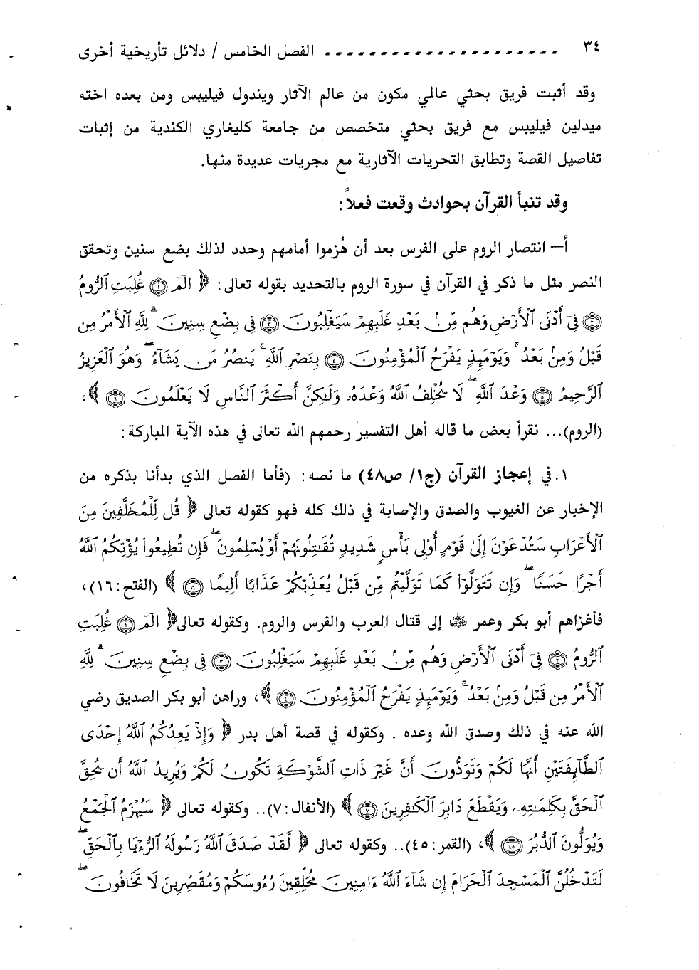 أ - انتصار الروم على الفرس بعد أن هزموا أمامهم وحدد لذلك بضع سنين وتحقق النصر مثل ما ذكر في القرآن في سورة الروم بالتحديد بقوله تعالى: الم (1) غُلِبَتِ الرُّومُ (2) فِي أَدْنَى الْأَرْضِ وهُمْ مِنْ بَعْدِ غَلَبِهِمْ سَيَغْلِبُونَ (3) فِي بِضْعِ سِنِينَ لِلَّهِ الْأَمْرُ مِنْ قَبْلُ ومِنْ بَعْدُ ويَوْمَئِذٍ يَفْرَحُ الْمُؤْمِنُونَ (4) بِنَصْرِ اللَّهِ يَنْصُرُ مَنْ يَشاءُ وهُوَ الْعَزِيزُ الرَّحِيمُ (5) وَعْدَ اللَّهِ لا يُخْلِفُ اللَّهُ وَعْدَهُ ولكِنَّ أَكْثَرَ النَّاسِ لا يَعْلَمُونَ (6)، (الروم) ... نقرأ بعض ما قاله أهل التفسير رحمهم اللّه تعالى في هذه الآية المباركة: