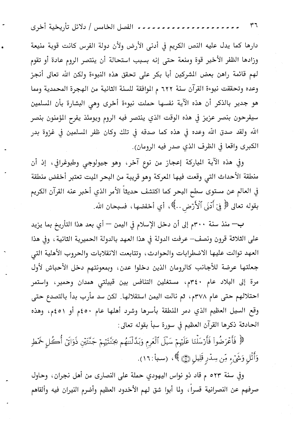 دارها كما يدل عليه النص الكريم في أدنى الأرض ولأن دولة الفرس كانت قوية منيعة وزادها الظفر الأخير قوة ومنعة حتى إنه بسبب استحالة أن ينتصر الروم عادة أو تقوم لهم قائمة راهن بعض المشركين أبا بكر على تحقق هذه النبوءة ولكن اللّه تعالى أنجز وعده وتحققت نبوءة القرآن سنة 622 م الموافقة للسنة الثانية من الهجرة المحمدية ومما هو جدير بالذكر أن هذه الآية نفسها حملت نبوءة أخرى وهي البشارة بأن المسلمين سيفرحون بنصر عزيز في هذه الوقت الذي ينتصر فيه الروم ويومئذ يفرح المؤمنون بنصر اللّه ولقد صدق اللّه وعده في هذه كما صدقه في تلك وكان ظفر المسلمين في غزوة بدر الكبرى واقعا في الظرف الذي صدر فيه الرومان).