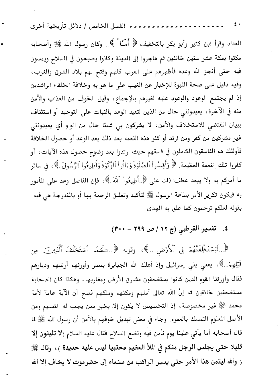 لَيَسْتَخْلِفَنَّهُمْ فِي الْأَرْضِ ... ، وقوله ... كَمَا اسْتَخْلَفَ الَّذِينَ مِنْ قَبْلِهِمْ ... ، يعني بني إسرائيل وإذ أهلك اللّه الجبابرة بمصر وأورثهم أرضهم وديارهم فقال وأورثنا القوم الذين كانوا يستضعفون مشارق الأرض ومغاربها، وهكذا كان الصحابة مستضعفين خائفين ثم إنّ اللّه تعالى أمنهم ومكنهم وملكهم فصح أن الآية عامة لأمة محمد صلّى اللّه عليه وسلم غير مخصوصة، إذ التخصيص لا يكون إلا بخبر ممن يجب له التسليم ومن الأصل المعلوم التمسك بالعموم. وجاء في معنى تبديل خوفهم بالأمن أن رسول اللّه صلّى اللّه عليه وسلم لما قال أصحابه أما يأتي علينا يوم نأمن فيه ونضع السلاح فقال عليه السلام (لا تلبثون إلا قليلا حتى يجلس الرجل منكم في الملأ العظيم محتبيا ليس عليه حديدة)، وقال صلّى اللّه عليه وسلم (واللّه ليتمن هذا الأمر حتى يسير الراكب من صنعاء إلى حضرموت لا يخاف إلا اللّه