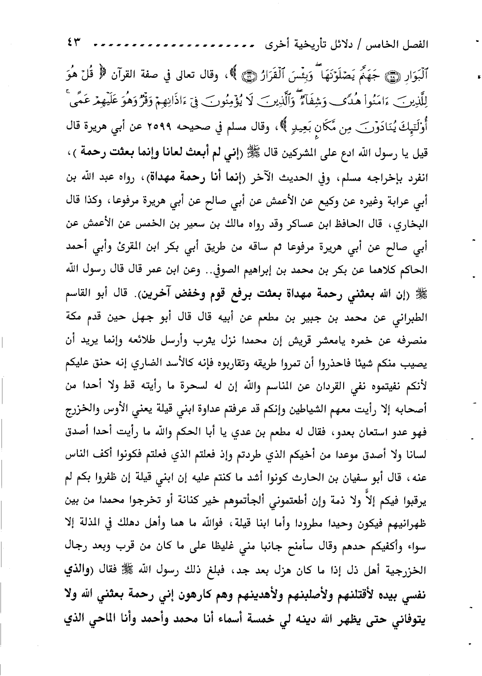 الْبَوارِ (28) جَهَنَّمَ يَصْلَوْنَها وبِئْسَ الْقَرارُ (29)، وقال تعالى في صفة القرآن قُلْ هُوَ لِلَّذِينَ آمَنُوا هُدىً وشِفاءٌ والَّذِينَ لا يُؤْمِنُونَ فِي آذانِهِمْ وَقْرٌ وهُوَ عَلَيْهِمْ عَمًى أُولئِكَ يُنادَوْنَ مِنْ مَكانٍ بَعِيدٍ، وقال مسلم في صحيحه 2599 عن أبي هريرة قال قيل يا رسول اللّه ادع على المشركين قال صلّى اللّه عليه وسلم (إني لم أبعث لعانا وإنما بعثت رحمة)، انفرد بإخراجه مسلم، وفي الحديث الآخر (إنما أنا رحمة مهداة)، رواه عبد اللّه بن أبي عرابة وغيره عن وكيع عن الأعمش عن أبي صالح عن أبي هريرة مرفوعا، وكذا قال البخاري، قال الحافظ ابن عساكر وقد رواه مالك بن سعير بن الخمس عن الأعمش عن أبي صالح عن أبي هريرة مرفوعا ثم ساقه من طريق أبي بكر ابن المقرئ وأبي أحمد الحاكم كلاهما عن بكر بن محمد بن إبراهيم الصوفي .. وعن ابن عمر قال قال رسول اللّه صلّى اللّه عليه وسلم (إن اللّه بعثني رحمة مهداة بعثت برفع قوم وخفض آخرين). قال أبو القاسم الطبراني عن محمد بن جبير بن مطعم عن أبيه قال قال أبو جهل حين قدم مكة منصرفه عن خمره يا معشر قريش إن محمدا نزل يثرب وأرسل طلائعه وإنما يريد أن يصيب منكم شيئا فاحذروا أن تمروا طريقه وتقاربوه فإنه كالأسد الضاري إنه حنق عليكم لأنكم نفيتموه نفي القردان عن المناسم واللّه إن له لسحرة ما رأيته قط ولا أحدا من أصحابه إلا رأيت معهم الشياطين وإنكم قد عرفتم عداوة ابني قيلة يعني الأوس والخزرج فهو عدو استعان بعدو، فقال له مطعم بن عدي يا أبا الحكم واللّه ما رأيت أحدا أصدق لسانا ولا أصدق موعدا من أخيكم الذي طردتم وإذ فعلتم الذي فعلتم فكونوا أكف الناس عنه، قال أبو سفيان بن الحارث كونوا أشد ما كنتم عليه إن ابني قيلة إن ظفروا بكم لم يرقبوا فيكم إلّا ولا ذمة وإن أطعتموني ألجأتموهم خير كنانة أو تخرجوا محمدا من بين ظهرانيهم فيكون وحيدا مطرودا وأما ابنا قيلة، فو اللّه ما هما وأهل دهلك في المذلة إلا سواء وأكفيكم حدهم وقال سأمنح جانبا مني غليظا على ما كان من قرب وبعد رجال الخزرجية أهل ذل إذا ما كان هزل بعد جد، فبلغ ذلك رسول اللّه صلّى اللّه عليه وسلم فقال (والذي نفسي بيده لأقتلنهم ولأصلبنهم ولأهدينهم وهم كارهون إني رحمة بعثني اللّه ولا يتوفاني حتى يظهر اللّه دينه لي خمسة أسماء أنا محمد وأحمد وأنا الماحي الذي
