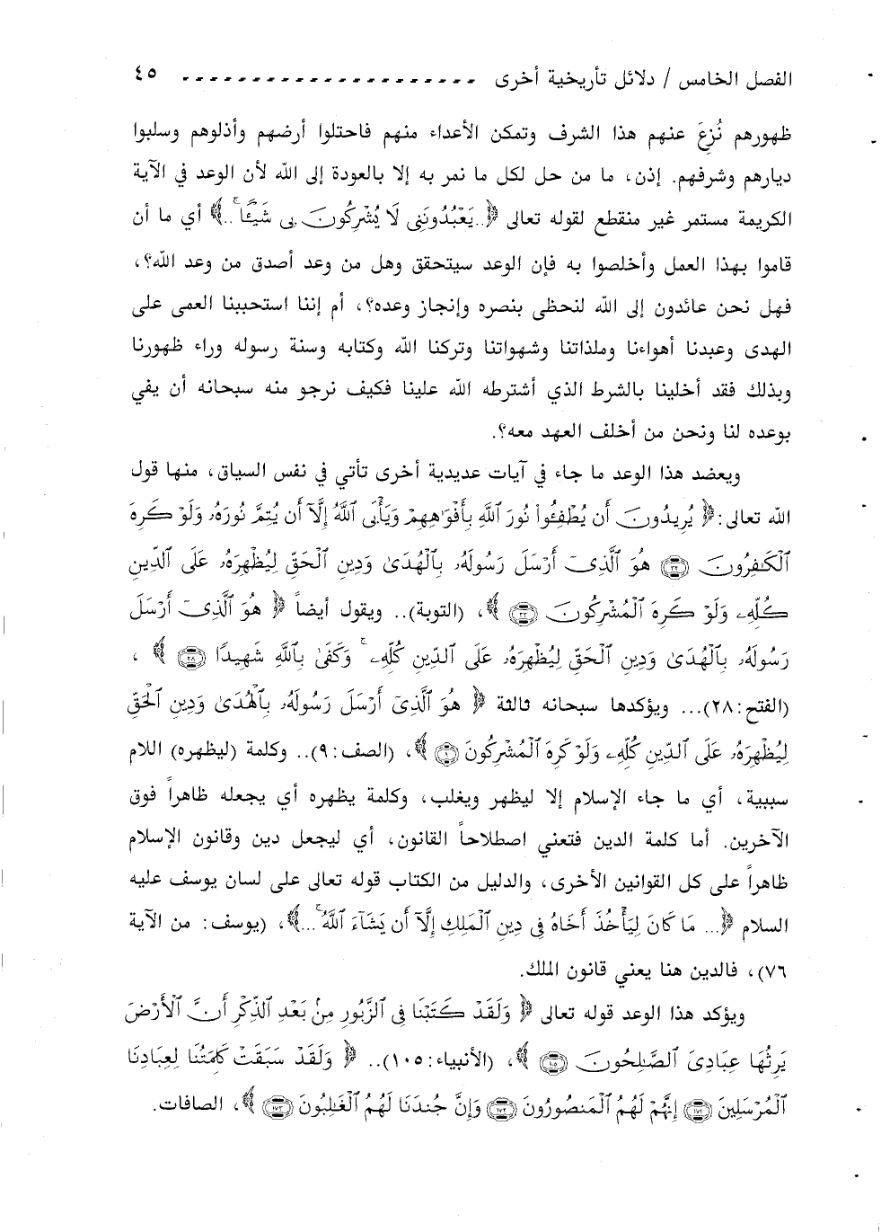 ويعضد هذا الوعد ما جاء في آيات عديدة أخرى تأتي في نفس السياق، منها قول اللّه تعالى: يُرِيدُونَ أَنْ يُطْفِؤُا نُورَ اللَّهِ بِأَفْواهِهِمْ ويَابَى اللَّهُ إِلَّا أَنْ يُتِمَّ نُورَهُ ولَوْ كَرِهَ الْكافِرُونَ (32) هُوَ الَّذِي أَرْسَلَ رَسُولَهُ بِالْهُدى ودِينِ الْحَقِّ لِيُظْهِرَهُ عَلَى الدِّينِ كُلِّهِ ولَوْ كَرِهَ الْمُشْرِكُونَ (33)، (التوبة) .. ويقول أيضا هُوَ الَّذِي أَرْسَلَ رَسُولَهُ بِالْهُدى ودِينِ الْحَقِّ لِيُظْهِرَهُ عَلَى الدِّينِ كُلِّهِ وكَفى بِاللَّهِ شَهِيداً (28)، (الفتح: 28) ... ويؤكدها سبحانه ثالثة هُوَ الَّذِي أَرْسَلَ رَسُولَهُ بِالْهُدى ودِينِ الْحَقِّ لِيُظْهِرَهُ عَلَى الدِّينِ كُلِّهِ ولَوْ كَرِهَ الْمُشْرِكُونَ (9)، (الصف: 9) .. وكلمة (ليظهره) اللام سببية، أي ما جاء الإسلام إلا ليظهر ويغلب، وكلمة يظهره أي يجعله ظاهرا فوق الآخرين. أما كلمة الدين فتعني اصطلاحا القانون، أي ليجعل دين وقانون الإسلام ظاهرا على كل القوانين الأخرى، والدليل من الكتاب قوله تعالى على لسان يوسف عليه السلام ... ما كانَ لِيَاخُذَ أَخاهُ فِي دِينِ الْمَلِكِ إِلَّا أَنْ يَشاءَ اللَّهُ ... ، (يوسف: من الآية 76)، فالدين هنا يعني قانون الملك.