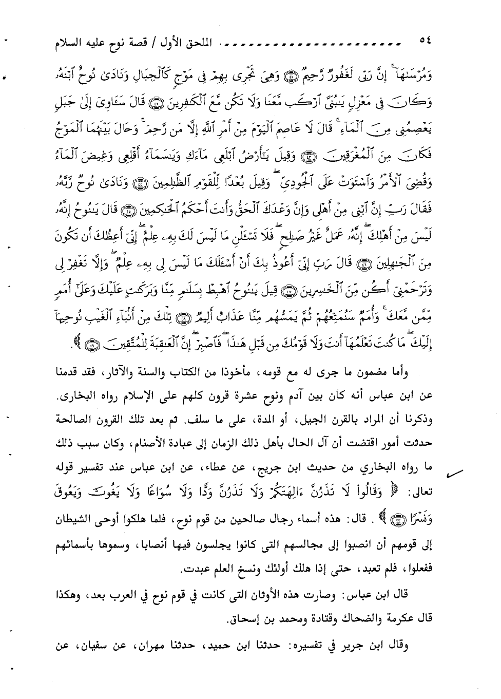 وذكرنا أن المراد بالقرن الجيل، أو المدة، على ما سلف. ثم بعد تلك القرون الصالحة حدثت أمور اقتضت أن آل الحال بأهل ذلك الزمان إلى عبادة الأصنام، وكان سبب ذلك ما رواه البخاري من حديث ابن جريج، عن عطاء، عن ابن عباس عند تفسير قوله تعالى: وقالُوا لا تَذَرُنَّ آلِهَتَكُمْ ولا تَذَرُنَّ وَدًّا ولا سُواعاً ولا يَغُوثَ ويَعُوقَ ونَسْراً (23). قال: هذه أسماء رجال صالحين من قوم نوح، فلما هلكوا أوحى الشيطان إلى قومهم أن انصبوا إلى مجالسهم التى كانوا يجلسون فيها أنصابا، وسموها بأسمائهم ففعلوا، فلم تعبد، حتى إذا هلك أولئك ونسخ العلم عبدت.