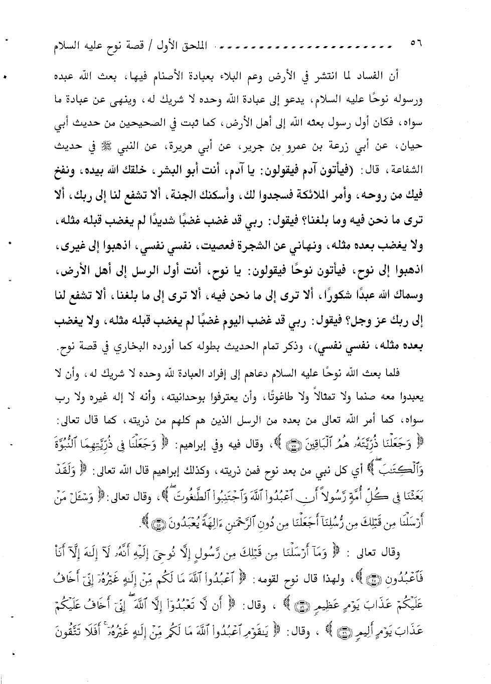 وَجَعَلْنا ذُرِّيَّتَهُ هُمُ الْباقِينَ (77)، وقال فيه وفي إبراهيم: وجَعَلْنا فِي ذُرِّيَّتِهِمَا النُّبُوَّةَ والْكِتابَ أي كل نبي من بعد نوح فمن ذريته، وكذلك إبراهيم قال اللّه تعالى: ولَقَدْ بَعَثْنا فِي كُلِّ أُمَّةٍ رَسُولًا أَنِ اعْبُدُوا اللَّهَ واجْتَنِبُوا الطَّاغُوتَ، وقال تعالى: وسْئَلْ مَنْ أَرْسَلْنا مِنْ قَبْلِكَ مِنْ رُسُلِنا أَجَعَلْنا مِنْ دُونِ الرَّحْمنِ آلِهَةً يُعْبَدُونَ (45).