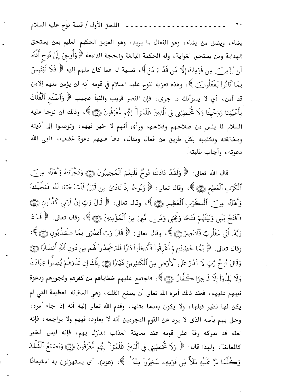 قال اللّه تعالى: ولَقَدْ نادانا نُوحٌ فَلَنِعْمَ الْمُجِيبُونَ (75) ونَجَّيْناهُ وأَهْلَهُ مِنَ الْكَرْبِ الْعَظِيمِ (76)، وقال تعالى: ونُوحاً إِذْ نادى مِنْ قَبْلُ فَاسْتَجَبْنا لَهُ فَنَجَّيْناهُ وأَهْلَهُ مِنَ الْكَرْبِ الْعَظِيمِ (76)، وقال تعالى: قالَ رَبِّ إِنَّ قَوْمِي كَذَّبُونِ (117) فَافْتَحْ بَيْنِي وبَيْنَهُمْ فَتْحاً ونَجِّنِي ومَنْ مَعِيَ مِنَ الْمُؤْمِنِينَ (118)، وقال تعالى: فَدَعا رَبَّهُ أَنِّي مَغْلُوبٌ فَانْتَصِرْ (10)، وقال تعالى: قالَ رَبِّ انْصُرْنِي بِما كَذَّبُونِ (26)، وقال تعالى: مِمَّا خَطِيئاتِهِمْ أُغْرِقُوا فَأُدْخِلُوا ناراً فَلَمْ يَجِدُوا لَهُمْ مِنْ دُونِ اللَّهِ أَنْصاراً (25) وقالَ نُوحٌ رَبِّ لا تَذَرْ عَلَى الْأَرْضِ مِنَ الْكافِرِينَ دَيَّاراً (26) إِنَّكَ إِنْ تَذَرْهُمْ يُضِلُّوا عِبادَكَ ولا يَلِدُوا إِلَّا فاجِراً كَفَّاراً (27)، فاجتمع عليهم خطاياهم من كفرهم وفجورهم ودعوة نبيهم عليهم، فعند ذلك أمره اللّه تعالى أن يصنع الفلك، وهي السفينة العظيمة التي لم يكن لها نظير قبلها، ولا يكون بعدها مثلها، وقدم اللّه تعالى إليه أنه إذا جاء أمره، وحل بهم بأسه الذى لا يرد عن القوم المجرمين أنه لا يعاوده فيهم ولا يراجعه، فإنه لعله قد تدركه رقة على قومه عند معاينة العذاب النازل بهم، فإنه ليس الخبر كالمعاينة، ولهذا قال: ولا تُخاطِبْنِي فِي الَّذِينَ ظَلَمُوا إِنَّهُمْ مُغْرَقُونَ (37) ويَصْنَعُ الْفُلْكَ وكُلَّما مَرَّ عَلَيْهِ مَلَأٌ مِنْ قَوْمِهِ سَخِرُوا مِنْهُ .. ، (هود). أي يستهزءون به استبعادا