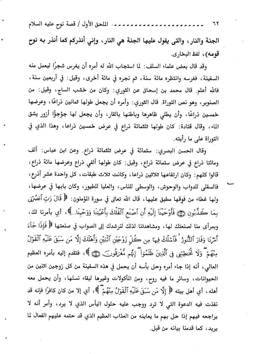وقال الحسن البصري: ستمائة في عرض ثلاثمائة ذراع. وعن ابن عباس: ألف ومائتا ذراع في عرض ستمائة ذراع، وقيل: كان طولها ألفي ذراع وعرضها مائة ذراع، قالوا كلهم: وكان ارتفاعها ثلاثين ذراعا، وكانت ثلاث طبقات، كل واحدة عشر أذرع، فالسفلى للدواب والوحوش، والوسطى للناس، والعليا للطيور، وكان بابها في عرضها، ولها غطاء من فوقها مطبق عليها، قال اللّه تعالى في سورة المؤمنون: قالَ رَبِّ انْصُرْنِي بِما كَذَّبُونِ (26) فَأَوْحَيْنا إِلَيْهِ أَنِ اصْنَعِ الْفُلْكَ بِأَعْيُنِنا ووَحْيِنا ... ، أي بأمرنا لك، وبمرأى منا لصنعتك لها، ومشاهدتنا لذلك لنرشدك إلى الصواب في صنعتها فَإِذا جاءَ أَمْرُنا وفارَ التَّنُّورُ فَاسْلُكْ فِيها مِنْ كُلٍّ زَوْجَيْنِ اثْنَيْنِ وأَهْلَكَ إِلَّا مَنْ سَبَقَ عَلَيْهِ الْقَوْلُ مِنْهُمْ ولا تُخاطِبْنِي فِي الَّذِينَ ظَلَمُوا إِنَّهُمْ مُغْرَقُونَ (27)، فتقدم إليه بأمره العظيم العالي، أنه إذا جاء أمره وحل بأسه أن يحمل في هذه السفينة من كل زوجين اثنين من الحيوانات، وسائر ما فيه روح، ومن المأكولات وغيرها لبقاء نسلها، وأن يحمل معه أهله، أي أهل بيته إِلَّا مَنْ سَبَقَ عَلَيْهِ الْقَوْلُ مِنْهُمْ، أي إلا من كان كافرا فإنه قد نفذت فيه الدعوة التي لا ترد ووجب عليه حلول البأس الذي لا يرد، وأمر أنه لا يراجعه فيهم إذا حل بهم ما يعاينه من العذاب العظيم الذي قد حتمه عليهم الفعال لما يريد، كما قدمنا بيانه من قبل.