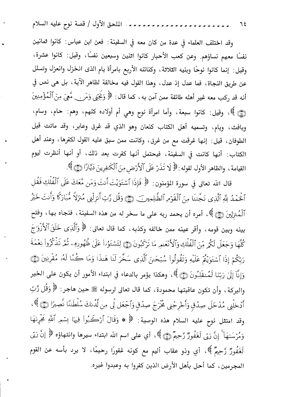 قال اللّه تعالى في سورة المؤمنون: فَإِذَا اسْتَوَيْتَ أَنْتَ ومَنْ مَعَكَ عَلَى الْفُلْكِ فَقُلِ الْحَمْدُ لِلَّهِ الَّذِي نَجَّانا مِنَ الْقَوْمِ الظَّالِمِينَ (28) وقُلْ رَبِّ أَنْزِلْنِي مُنْزَلًا مُبارَكاً وأَنْتَ خَيْرُ الْمُنْزِلِينَ (29)، أمره أن يحمد ربه على ما سخر له من هذه السفينة، فنجاه بها، وفتح بينه وبين قومه، وأقر عينه ممن خالفه وكذبه، كما قال تعالى: والَّذِي خَلَقَ الْأَزْواجَ كُلَّها وجَعَلَ لَكُمْ مِنَ الْفُلْكِ والْأَنْعامِ ما تَرْكَبُونَ (12) لِتَسْتَوُوا عَلى ظُهُورِهِ ثُمَّ تَذْكُرُوا نِعْمَةَ رَبِّكُمْ إِذَا اسْتَوَيْتُمْ عَلَيْهِ وتَقُولُوا سُبْحانَ الَّذِي سَخَّرَ لَنا هذا وما كُنَّا لَهُ مُقْرِنِينَ (13) وإِنَّا إِلى رَبِّنا لَمُنْقَلِبُونَ (14)، وهكذا يؤمر بالدعاء في ابتداء الأمور أن يكون على الخير والبركة، وأن تكون عاقبتها محمودة، كما قال تعالى لرسوله صلّى اللّه عليه وسلم حين هاجر: وقُلْ رَبِّ أَدْخِلْنِي مُدْخَلَ صِدْقٍ وأَخْرِجْنِي مُخْرَجَ صِدْقٍ واجْعَلْ لِي مِنْ لَدُنْكَ سُلْطاناً نَصِيراً (80)، وقد امتثل نوح عليه السلام هذه الوصية: وقالَ ارْكَبُوا فِيها بِسْمِ اللَّهِ مَجْراها ومُرْساها إِنَّ رَبِّي لَغَفُورٌ رَحِيمٌ (41)، أي على اسم اللّه ابتداء سيرها وانتهاؤه إِنَّ رَبِّي لَغَفُورٌ رَحِيمٌ، أي وذو عقاب أليم مع كونه غفورا رحيما، لا يرد بأسه عن القوم المجرمين، كما أحل بأهل الأرض الذين كفروا به وعبدوا غيره.