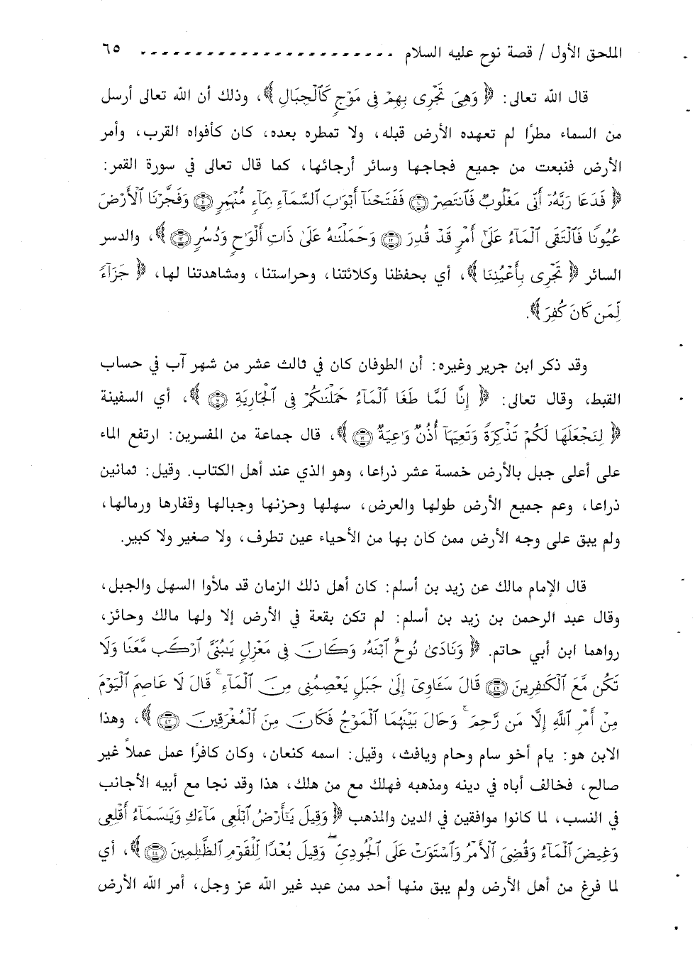 قال الإمام مالك عن زيد بن أسلم: كان أهل ذلك الزمان قد ملئوا السهل والجبل، وقال عبد الرحمن بن زيد بن أسلم: لم تكن بقعة في الأرض إلا ولها مالك وحائز، رواهما ابن أبي حاتم. ونادى نُوحٌ ابْنَهُ وكانَ فِي مَعْزِلٍ يا بُنَيَّ ارْكَبْ مَعَنا ولا تَكُنْ مَعَ الْكافِرِينَ (42) قالَ سَآوِي إِلى جَبَلٍ يَعْصِمُنِي مِنَ الْماءِ قالَ لا عاصِمَ الْيَوْمَ مِنْ أَمْرِ اللَّهِ إِلَّا مَنْ رَحِمَ وحالَ بَيْنَهُمَا الْمَوْجُ فَكانَ مِنَ الْمُغْرَقِينَ (43)، وهذا الابن هو: يام أخو سام وحام ويافث، وقيل: اسمه كنعان، وكان كافرا عمل عملا غير صالح، فخالف أباه في دينه ومذهبه فهلك مع من هلك، هذا وقد نجا مع أبيه الأجانب في النسب، لما كانوا موافقين في الدين والمذهب وقِيلَ يا أَرْضُ ابْلَعِي ماءَكِ ويا سَماءُ أَقْلِعِي وغِيضَ الْماءُ وقُضِيَ الْأَمْرُ واسْتَوَتْ عَلَى الْجُودِيِّ وقِيلَ بُعْداً لِلْقَوْمِ الظَّالِمِينَ (44)، أي لما فرغ من أهل الأرض ولم يبق منها أحد ممن عبد غير اللّه عزّ وجلّ، أمر اللّه الأرض
