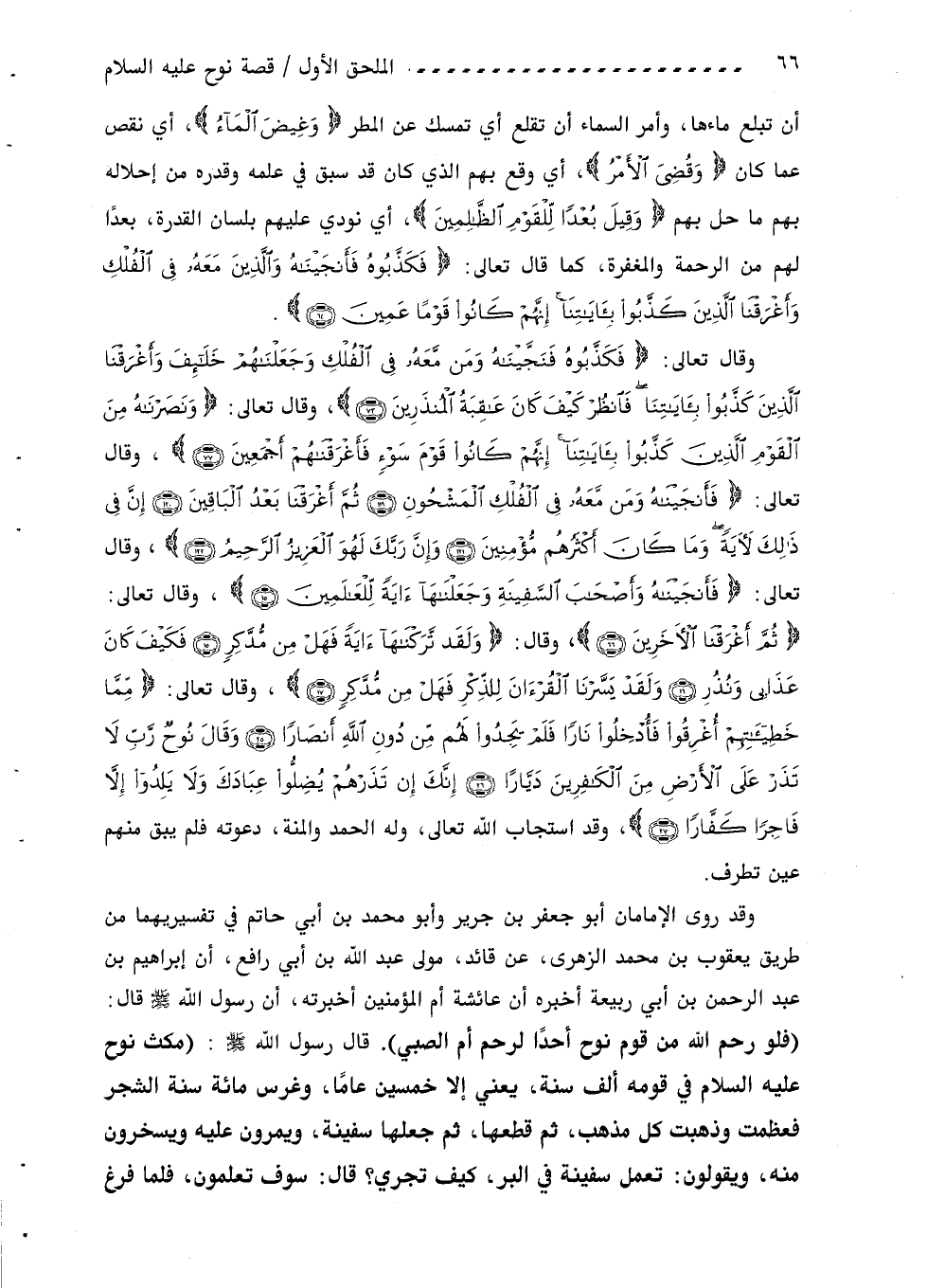 ثُمَّ أَغْرَقْنَا الْآخَرِينَ (66)، وقال: ولَقَدْ تَرَكْناها آيَةً فَهَلْ مِنْ مُدَّكِرٍ (15) فَكَيْفَ كانَ عَذابِي ونُذُرِ (16) ولَقَدْ يَسَّرْنَا الْقُرْآنَ لِلذِّكْرِ فَهَلْ مِنْ مُدَّكِرٍ (17)، وقال تعالى: مِمَّا خَطِيئاتِهِمْ أُغْرِقُوا فَأُدْخِلُوا ناراً فَلَمْ يَجِدُوا لَهُمْ مِنْ دُونِ اللَّهِ أَنْصاراً (25) وقالَ نُوحٌ رَبِّ لا تَذَرْ عَلَى الْأَرْضِ مِنَ الْكافِرِينَ دَيَّاراً (26) إِنَّكَ إِنْ تَذَرْهُمْ يُضِلُّوا عِبادَكَ ولا يَلِدُوا إِلَّا فاجِراً كَفَّاراً (27)، وقد استجاب اللّه تعالى، وله الحمد والمنة، دعوته فلم يبق منهم عين تطرف.
