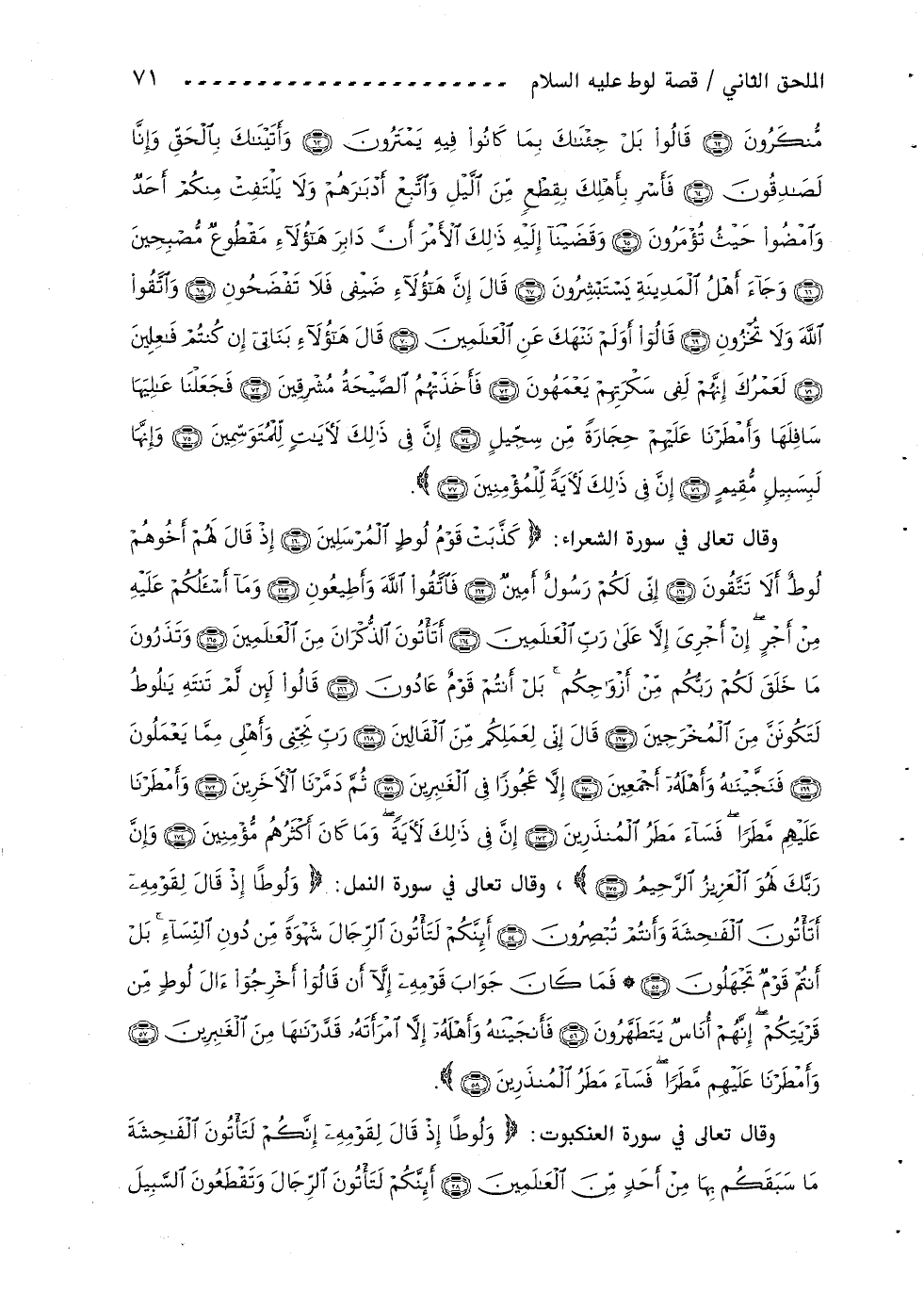 وقال تعالى في سورة الشعراء: كَذَّبَتْ قَوْمُ لُوطٍ الْمُرْسَلِينَ (160) إِذْ قالَ لَهُمْ أَخُوهُمْ لُوطٌ أَلا تَتَّقُونَ (161) إِنِّي لَكُمْ رَسُولٌ أَمِينٌ (162) فَاتَّقُوا اللَّهَ وأَطِيعُونِ (163) وما أَسْئَلُكُمْ عَلَيْهِ مِنْ أَجْرٍ إِنْ أَجْرِيَ إِلَّا عَلى رَبِّ الْعالَمِينَ (164) أَتَاتُونَ الذُّكْرانَ مِنَ الْعالَمِينَ (165) وتَذَرُونَ ما خَلَقَ لَكُمْ رَبُّكُمْ مِنْ أَزْواجِكُمْ بَلْ أَنْتُمْ قَوْمٌ عادُونَ (166) قالُوا لَئِنْ لَمْ تَنْتَهِ يا لُوطُ لَتَكُونَنَّ مِنَ الْمُخْرَجِينَ (167) قالَ إِنِّي لِعَمَلِكُمْ مِنَ الْقالِينَ (168) رَبِّ نَجِّنِي وأَهْلِي مِمَّا يَعْمَلُونَ (169) فَنَجَّيْناهُ وأَهْلَهُ أَجْمَعِينَ (170) إِلَّا عَجُوزاً فِي الْغابِرِينَ (171) ثُمَّ دَمَّرْنَا الْآخَرِينَ (172) وأَمْطَرْنا عَلَيْهِمْ مَطَراً فَساءَ مَطَرُ الْمُنْذَرِينَ (173) إِنَّ فِي ذلِكَ لَآيَةً وما كانَ أَكْثَرُهُمْ مُؤْمِنِينَ (174) وإِنَّ رَبَّكَ لَهُوَ الْعَزِيزُ الرَّحِيمُ (175)، وقال تعالى في سورة النمل: ولُوطاً إِذْ قالَ لِقَوْمِهِ أَتَاتُونَ الْفاحِشَةَ وأَنْتُمْ تُبْصِرُونَ (54) أَإِنَّكُمْ لَتَاتُونَ الرِّجالَ شَهْوَةً مِنْ دُونِ النِّساءِ بَلْ أَنْتُمْ قَوْمٌ تَجْهَلُونَ (55) فَما كانَ جَوابَ قَوْمِهِ إِلَّا أَنْ قالُوا أَخْرِجُوا آلَ لُوطٍ مِنْ قَرْيَتِكُمْ إِنَّهُمْ أُناسٌ يَتَطَهَّرُونَ (56) فَأَنْجَيْناهُ وأَهْلَهُ إِلَّا امْرَأَتَهُ قَدَّرْناها مِنَ الْغابِرِينَ (57) وأَمْطَرْنا عَلَيْهِمْ مَطَراً فَساءَ مَطَرُ الْمُنْذَرِينَ (58).