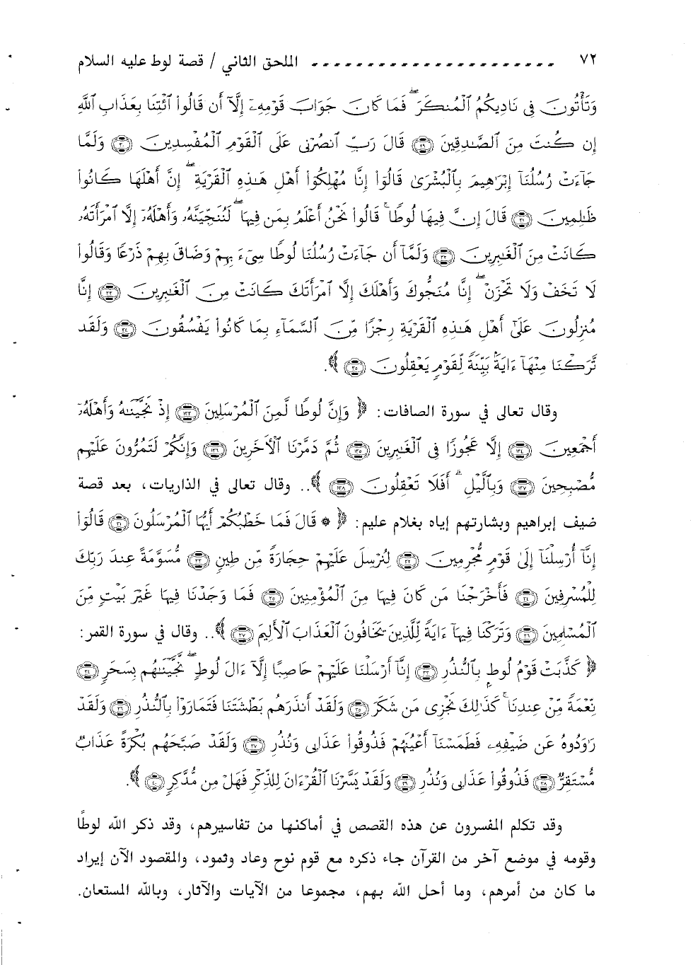 وقد تكلم المفسرون عن هذه القصص في أماكنها من تفاسيرهم، وقد ذكر اللّه لوطا وقومه في موضع آخر من القرآن جاء ذكره مع قوم نوح وعاد وثمود، والمقصود الآن إيراد ما كان من أمرهم، وما أحل اللّه بهم، مجموعا من الآيات والآثار، وباللّه المستعان.