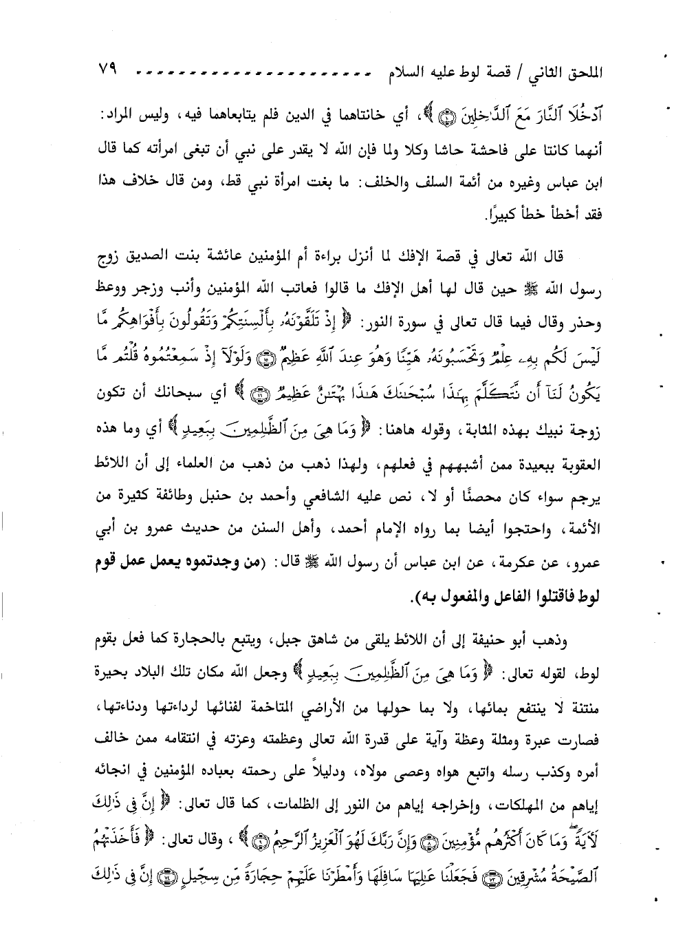 قال اللّه تعالى في قصة الإفك لما أنزل براءة أم المؤمنين عائشة بنت الصديق زوج رسول اللّه صلّى اللّه عليه وسلم حين قال لها أهل الإفك ما قالوا فعاتب اللّه المؤمنين وأنب وزجر ووعظ وحذر وقال فيما قال تعالى في سورة النور: إِذْ تَلَقَّوْنَهُ بِأَلْسِنَتِكُمْ وتَقُولُونَ بِأَفْواهِكُمْ ما لَيْسَ لَكُمْ بِهِ عِلْمٌ وتَحْسَبُونَهُ هَيِّناً وهُوَ عِنْدَ اللَّهِ عَظِيمٌ (15) ولَوْ لا إِذْ سَمِعْتُمُوهُ قُلْتُمْ ما يَكُونُ لَنا أَنْ نَتَكَلَّمَ بِهذا سُبْحانَكَ هذا بُهْتانٌ عَظِيمٌ (16) أي سبحانك أن تكون زوجة نبيك بهذه المثابة، وقوله هاهنا: وما هِيَ مِنَ الظَّالِمِينَ بِبَعِيدٍ أي وما هذه العقوبة ببعيدة ممن أشبههم في فعلهم، ولهذا ذهب من ذهب من العلماء إلى أن اللائط يرجم سواء كان محصنا أو لا، نص عليه الشافعي وأحمد بن حنبل وطائفة كثيرة من الأئمة، واحتجوا أيضا بما رواه الإمام أحمد، وأهل السنن من حديث عمرو بن أبي عمرو، عن عكرمة، عن ابن عباس أن رسول اللّه صلّى اللّه عليه وسلم قال: (من وجدتموه يعمل عمل قوم لوط فاقتلوا الفاعل والمفعول به).