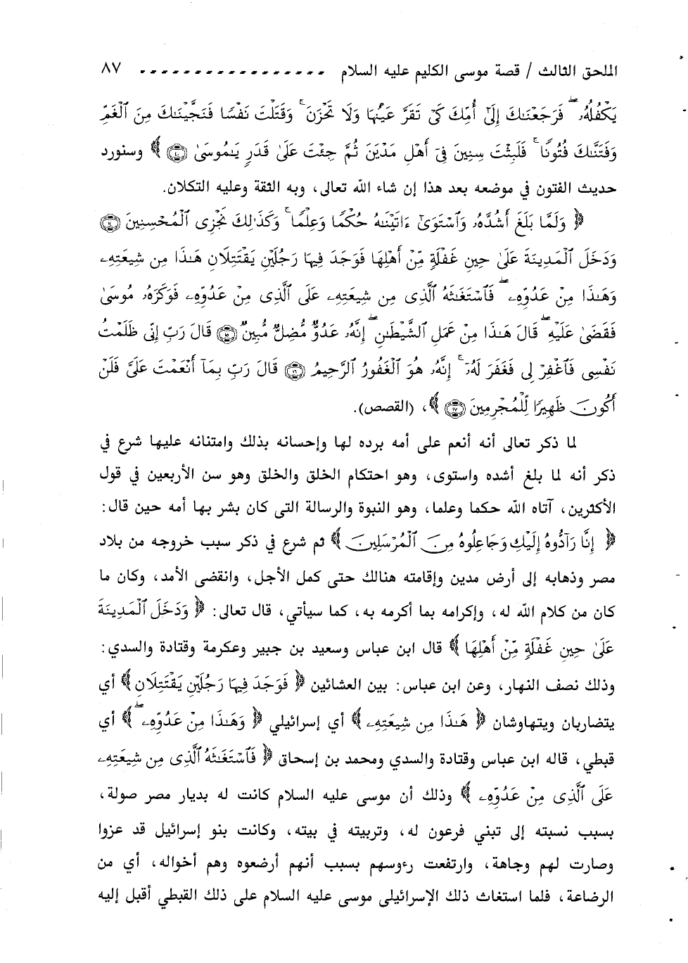 وَلَمَّا بَلَغَ أَشُدَّهُ واسْتَوى آتَيْناهُ حُكْماً وعِلْماً وكَذلِكَ نَجْزِي الْمُحْسِنِينَ (14) ودَخَلَ الْمَدِينَةَ عَلى حِينِ غَفْلَةٍ مِنْ أَهْلِها فَوَجَدَ فِيها رَجُلَيْنِ يَقْتَتِلانِ هذا مِنْ شِيعَتِهِ وهذا مِنْ عَدُوِّهِ فَاسْتَغاثَهُ الَّذِي مِنْ شِيعَتِهِ عَلَى الَّذِي مِنْ عَدُوِّهِ فَوَكَزَهُ مُوسى فَقَضى عَلَيْهِ قالَ هذا مِنْ عَمَلِ الشَّيْطانِ إِنَّهُ عَدُوٌّ مُضِلٌّ مُبِينٌ (15) قالَ رَبِّ إِنِّي ظَلَمْتُ نَفْسِي فَاغْفِرْ لِي فَغَفَرَ لَهُ إِنَّهُ هُوَ الْغَفُورُ الرَّحِيمُ (16) قالَ رَبِّ بِما أَنْعَمْتَ عَلَيَّ فَلَنْ أَكُونَ ظَهِيراً لِلْمُجْرِمِينَ (17)، (القصص).