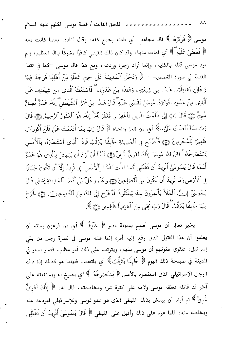 موسى فَوَكَزَهُ قال مجاهد: أي طعنه بجمع كفه، وقال قتادة: بعصا كانت معه فَقَضى عَلَيْهِ أي فمات منها، وقد كان ذلك القبطي كافرا مشركا باللّه العظيم، ولم يرد موسى قتله بالكلية، وإنما أراد زجره وردعه، ومع هذا قال موسى - كما في تتمة القصة في سورة القصص - : ودَخَلَ الْمَدِينَةَ عَلى حِينِ غَفْلَةٍ مِنْ أَهْلِها فَوَجَدَ فِيها رَجُلَيْنِ يَقْتَتِلانِ هذا مِنْ شِيعَتِهِ وهذا مِنْ عَدُوِّهِ فَاسْتَغاثَهُ الَّذِي مِنْ شِيعَتِهِ عَلَى الَّذِي مِنْ عَدُوِّهِ فَوَكَزَهُ مُوسى فَقَضى عَلَيْهِ قالَ هذا مِنْ عَمَلِ الشَّيْطانِ إِنَّهُ عَدُوٌّ مُضِلٌّ مُبِينٌ (15) قالَ رَبِّ إِنِّي ظَلَمْتُ نَفْسِي فَاغْفِرْ لِي فَغَفَرَ لَهُ إِنَّهُ هُوَ الْغَفُورُ الرَّحِيمُ (16) قالَ رَبِّ بِما أَنْعَمْتَ عَلَيَّ .. أي من العز والجاه قالَ رَبِّ بِما أَنْعَمْتَ عَلَيَّ فَلَنْ أَكُونَ ظَهِيراً لِلْمُجْرِمِينَ (17) فَأَصْبَحَ فِي الْمَدِينَةِ خائِفاً يَتَرَقَّبُ فَإِذَا الَّذِي اسْتَنْصَرَهُ بِالْأَمْسِ يَسْتَصْرِخُهُ قالَ لَهُ مُوسى إِنَّكَ لَغَوِيٌّ مُبِينٌ (18) فَلَمَّا أَنْ أَرادَ أَنْ يَبْطِشَ بِالَّذِي هُوَ عَدُوٌّ لَهُما قالَ يا مُوسى أَتُرِيدُ أَنْ تَقْتُلَنِي كَما قَتَلْتَ نَفْساً بِالْأَمْسِ إِنْ تُرِيدُ إِلَّا أَنْ تَكُونَ جَبَّاراً فِي الْأَرْضِ وما تُرِيدُ أَنْ تَكُونَ مِنَ الْمُصْلِحِينَ (19) وجاءَ رَجُلٌ مِنْ أَقْصَى الْمَدِينَةِ يَسْعى قالَ يا مُوسى إِنَّ الْمَلَأَ يَاتَمِرُونَ بِكَ لِيَقْتُلُوكَ فَاخْرُجْ إِنِّي لَكَ مِنَ النَّاصِحِينَ (20) فَخَرَجَ مِنْها خائِفاً يَتَرَقَّبُ قالَ رَبِّ نَجِّنِي مِنَ الْقَوْمِ الظَّالِمِينَ (21).