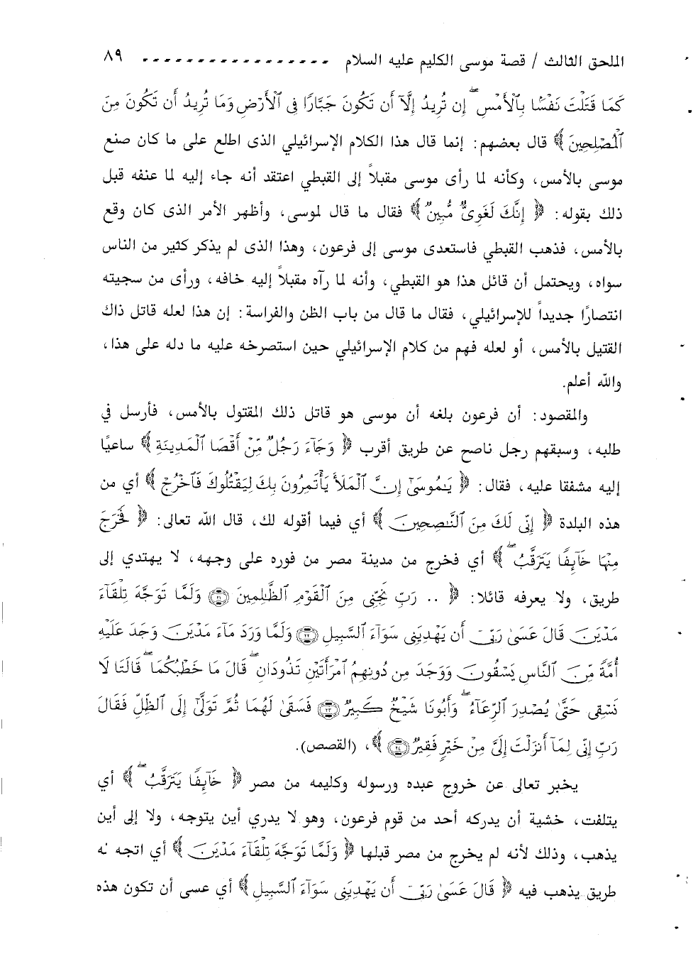 كَما قَتَلْتَ نَفْساً بِالْأَمْسِ إِنْ تُرِيدُ إِلَّا أَنْ تَكُونَ جَبَّاراً فِي الْأَرْضِ وما تُرِيدُ أَنْ تَكُونَ مِنَ الْمُصْلِحِينَ قال بعضهم: إنما قال هذا الكلام الإسرائيلي الذى اطلع على ما كان صنع موسى بالأمس، وكأنه لما رأى موسى مقبلا إلى القبطي اعتقد أنه جاء إليه لما عنفه قبل ذلك بقوله: إِنَّكَ لَغَوِيٌّ مُبِينٌ فقال ما قال لموسى، وأظهر الأمر الذى كان وقع بالأمس، فذهب القبطي فاستعدى موسى إلى فرعون، وهذا الذى لم يذكر كثير من الناس سواه، ويحتمل أن قائل هذا هو القبطي، وأنه لما رآه مقبلا إليه خافه، ورأى من سجيته انتصارا جديدا للإسرائيلي، فقال ما قال من باب الظن والفراسة: إن هذا لعله قاتل ذاك القتيل بالأمس، أو لعله فهم من كلام الإسرائيلي حين استصرخه عليه ما دله على هذا، واللّه أعلم.