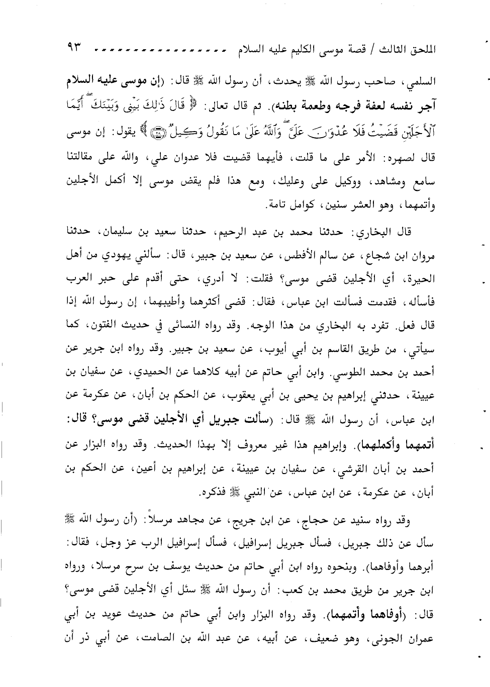 قال البخاري: حدثنا محمد بن عبد الرحيم، حدثنا سعيد بن سليمان، حدثنا مروان ابن شجاع، عن سالم الأفطس، عن سعيد بن جبير، قال: سألني يهودي من أهل الحيرة، أي الأجلين قضى موسى؟ فقلت: لا أدري، حتى أقدم على حبر العرب فأسأله، فقدمت فسألت ابن عباس، فقال: قضى أكثرهما وأطيبهما، إن رسول اللّه إذا قال فعل. تفرد به البخاري من هذا الوجه. وقد رواه النسائى في حديث الفتون، كما سيأتي، من طريق القاسم بن أبي أيوب، عن سعيد بن جبير. وقد رواه ابن جرير عن أحمد بن محمد الطوسي. وابن أبي حاتم عن أبيه كلاهما عن الحميدي، عن سفيان بن عيينة، حدثني إبراهيم بن يحيى بن أبي يعقوب، عن الحكم بن أبان، عن عكرمة عن ابن عباس، أن رسول اللّه صلّى اللّه عليه وسلم قال: (سألت جبريل أي الأجلين قضى موسى؟ قال: