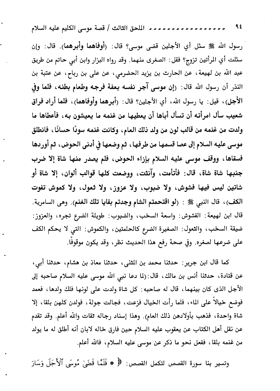 رسول اللّه صلّى اللّه عليه وسلم سئل أي الأجلين قضى موسى؟ قال: (أوفاهما وأبرهما). قال: وإن سئلت أي المرأتين تزوج؟ فقل: الصغرى منهما. وقد رواه البزار وابن أبي حاتم من طريق عبد اللّه بن لهيعة، عن الحارث بن يزيد الحضرمي، عن على بن رباح، عن عتبة بن النذر أن رسول اللّه قال: (إن موسى آجر نفسه بعفة فرجه وطعام بطنه، فلما وفي الأجل)، قيل: يا رسول اللّه، أي الأجلين؟ قال: (أبرهما وأوفاهما)، فلما أراد فراق شعيب سأل امرأته أن تسأل أباها أن يعطيها من غنمه ما يعيشون به، فأعطاها ما ولدت من غنمه من قالب لون من ولد ذلك العام، وكانت غنمه سودا حسانا، فانطلق موسى عليه السلام إلى عصا قسمها من طرفها، ثم وضعها في أدنى الحوض، ثم أوردها فسقاها، ووقف موسى عليه السّلام بإزاء الحوض، فلم يصدر منها شاة إلا ضرب جنبها شاة شاة، قال: فأتأمت، وآنثت، ووضعت كلها قوالب ألوان، إلا شاة أو شاتين ليس فيها فشوش، ولا ضبوب، ولا عزوز، ولا ثعول، ولا كموش تفوت الكف)، قال النبي صلّى اللّه عليه وسلم: (لو اقتحمتم الشام وجدتم بقايا تلك الغنم). وهى السامرية.