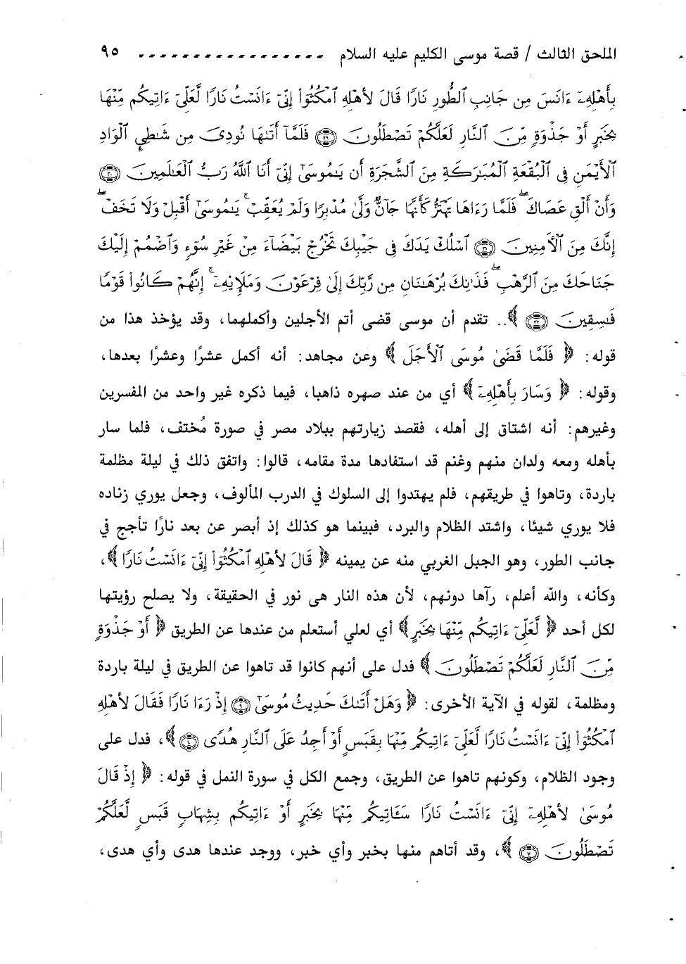 بِأَهْلِهِ آنَسَ مِنْ جانِبِ الطُّورِ ناراً قالَ لِأَهْلِهِ امْكُثُوا إِنِّي آنَسْتُ ناراً لَعَلِّي آتِيكُمْ مِنْها بِخَبَرٍ أَوْ جَذْوَةٍ مِنَ النَّارِ لَعَلَّكُمْ تَصْطَلُونَ (29) فَلَمَّا أَتاها نُودِيَ مِنْ شاطِئِ الْوادِ الْأَيْمَنِ فِي الْبُقْعَةِ الْمُبارَكَةِ مِنَ الشَّجَرَةِ أَنْ يا مُوسى إِنِّي أَنَا اللَّهُ رَبُّ الْعالَمِينَ (30) وأَنْ أَلْقِ عَصاكَ فَلَمَّا رَآها تَهْتَزُّ كَأَنَّها جَانٌّ وَلَّى مُدْبِراً ولَمْ يُعَقِّبْ يا مُوسى أَقْبِلْ ولا تَخَفْ إِنَّكَ مِنَ الْآمِنِينَ (31) اسْلُكْ يَدَكَ فِي جَيْبِكَ تَخْرُجْ بَيْضاءَ مِنْ غَيْرِ سُوءٍ واضْمُمْ إِلَيْكَ جَناحَكَ مِنَ الرَّهْبِ فَذانِكَ بُرْهانانِ مِنْ رَبِّكَ إِلى فِرْعَوْنَ ومَلَائِهِ إِنَّهُمْ كانُوا قَوْماً فاسِقِينَ (32) .. تقدم أن موسى قضى أتم الأجلين وأكملهما، وقد يؤخذ هذا من قوله: فَلَمَّا قَضى مُوسَى الْأَجَلَ وعن مجاهد: أنه أكمل عشرا وعشرا بعدها، وقوله: وسارَ بِأَهْلِهِ أي من عند صهره ذاهبا، فيما ذكره غير واحد من المفسرين وغيرهم: أنه اشتاق إلى أهله، فقصد زيارتهم ببلاد مصر في صورة مختف، فلما سار بأهله ومعه ولدان منهم وغنم قد استفادها مدة مقامه، قالوا: واتفق ذلك في ليلة مظلمة باردة، وتاهوا في طريقهم، فلم يهتدوا إلى السلوك في الدرب المألوف، وجعل يوري زناده فلا يوري شيئا، واشتد الظلام والبرد، فبينما هو كذلك إذ أبصر عن بعد نارا تأجج في جانب الطور، وهو الجبل الغربي منه عن يمينه قالَ لِأَهْلِهِ امْكُثُوا إِنِّي آنَسْتُ ناراً، وكأنه، واللّه أعلم، رآها دونهم، لأن هذه النار هى نور في الحقيقة، ولا يصلح رؤيتها لكل أحد لَعَلِّي آتِيكُمْ مِنْها بِخَبَرٍ أي لعلي أستعلم من عندها عن الطريق أَوْ جَذْوَةٍ مِنَ النَّارِ لَعَلَّكُمْ تَصْطَلُونَ فدل على أنهم كانوا قد تاهوا عن الطريق في ليلة باردة ومظلمة، لقوله في الآية الأخرى: وهَلْ أَتاكَ حَدِيثُ مُوسى (9) إِذْ رَأى ناراً فَقالَ لِأَهْلِهِ امْكُثُوا إِنِّي آنَسْتُ ناراً لَعَلِّي آتِيكُمْ مِنْها بِقَبَسٍ أَوْ أَجِدُ عَلَى النَّارِ هُدىً (10)، فدل على وجود الظلام، وكونهم تاهوا عن الطريق، وجمع الكل في سورة النمل في قوله: إِذْ قالَ مُوسى لِأَهْلِهِ إِنِّي آنَسْتُ ناراً سَآتِيكُمْ مِنْها بِخَبَرٍ أَوْ آتِيكُمْ بِشِهابٍ قَبَسٍ لَعَلَّكُمْ تَصْطَلُونَ (7)، وقد أتاهم منها بخبر وأي خبر، ووجد عندها هدى وأي هدى،