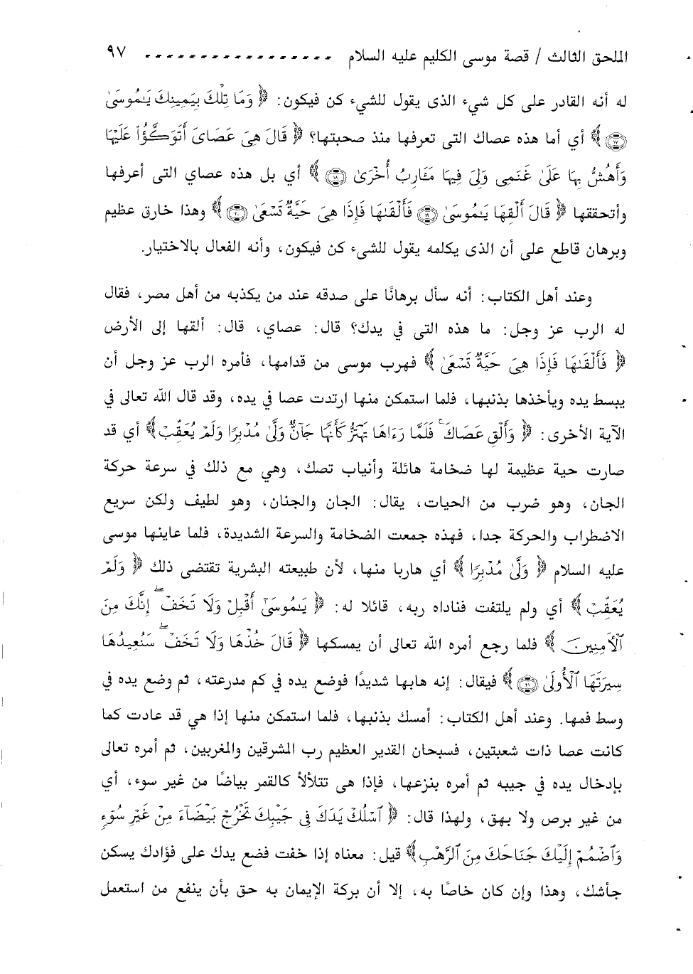 وعند أهل الكتاب: أنه سأل برهانا على صدقه عند من يكذبه من أهل مصر، فقال له الرب عز وجل: ما هذه التى في يدك؟ قال: عصاي، قال: ألقها إلى الأرض فَأَلْقاها فَإِذا هِيَ حَيَّةٌ تَسْعى فهرب موسى من قدامها، فأمره الرب عز وجل أن يبسط يده ويأخذها بذنبها، فلما استمكن منها ارتدت عصا في يده، وقد قال اللّه تعالى في الآية الأخرى: وأَلْقِ عَصاكَ فَلَمَّا رَآها تَهْتَزُّ كَأَنَّها جَانٌّ وَلَّى مُدْبِراً ولَمْ يُعَقِّبْ أي قد صارت حية عظيمة لها ضخامة هائلة وأنياب تصك، وهي مع ذلك في سرعة حركة الجان، وهو ضرب من الحيات، يقال: الجان والجنان، وهو لطيف ولكن سريع الاضطراب والحركة جدا، فهذه جمعت الضخامة والسرعة الشديدة، فلما عاينها موسى عليه السلام وَلَّى مُدْبِراً أي هاربا منها، لأن طبيعته البشرية تقتضى ذلك ولَمْ يُعَقِّبْ أي ولم يلتفت فناداه ربه، قائلا له: يا مُوسى أَقْبِلْ ولا تَخَفْ إِنَّكَ مِنَ الْآمِنِينَ فلما رجع أمره اللّه تعالى أن يمسكها قالَ خُذْها ولا تَخَفْ سَنُعِيدُها سِيرَتَهَا الْأُولى (21) فيقال: إنه هابها شديدا فوضع يده في كم مدرعته، ثم وضع يده في وسط فمها. وعند أهل الكتاب: أمسك بذنبها، فلما استمكن منها إذا هي قد عادت كما كانت عصا ذات شعبتين، فسبحان القدير العظيم رب المشرقين والمغربين، ثم أمره تعالى بإدخال يده في جيبه ثم أمره بنزعها، فإذا هى تتلألأ كالقمر بياضا من غير سوء، أي من غير برص ولا بهق، ولهذا قال: اسْلُكْ يَدَكَ فِي جَيْبِكَ تَخْرُجْ بَيْضاءَ مِنْ غَيْرِ سُوءٍ واضْمُمْ إِلَيْكَ جَناحَكَ مِنَ الرَّهْبِ قيل: معناه إذا خفت فضع يدك على فؤادك يسكن جأشك، وهذا وإن كان خاصا به، إلا أن بركة الإيمان به حق بأن ينفع من استعمل