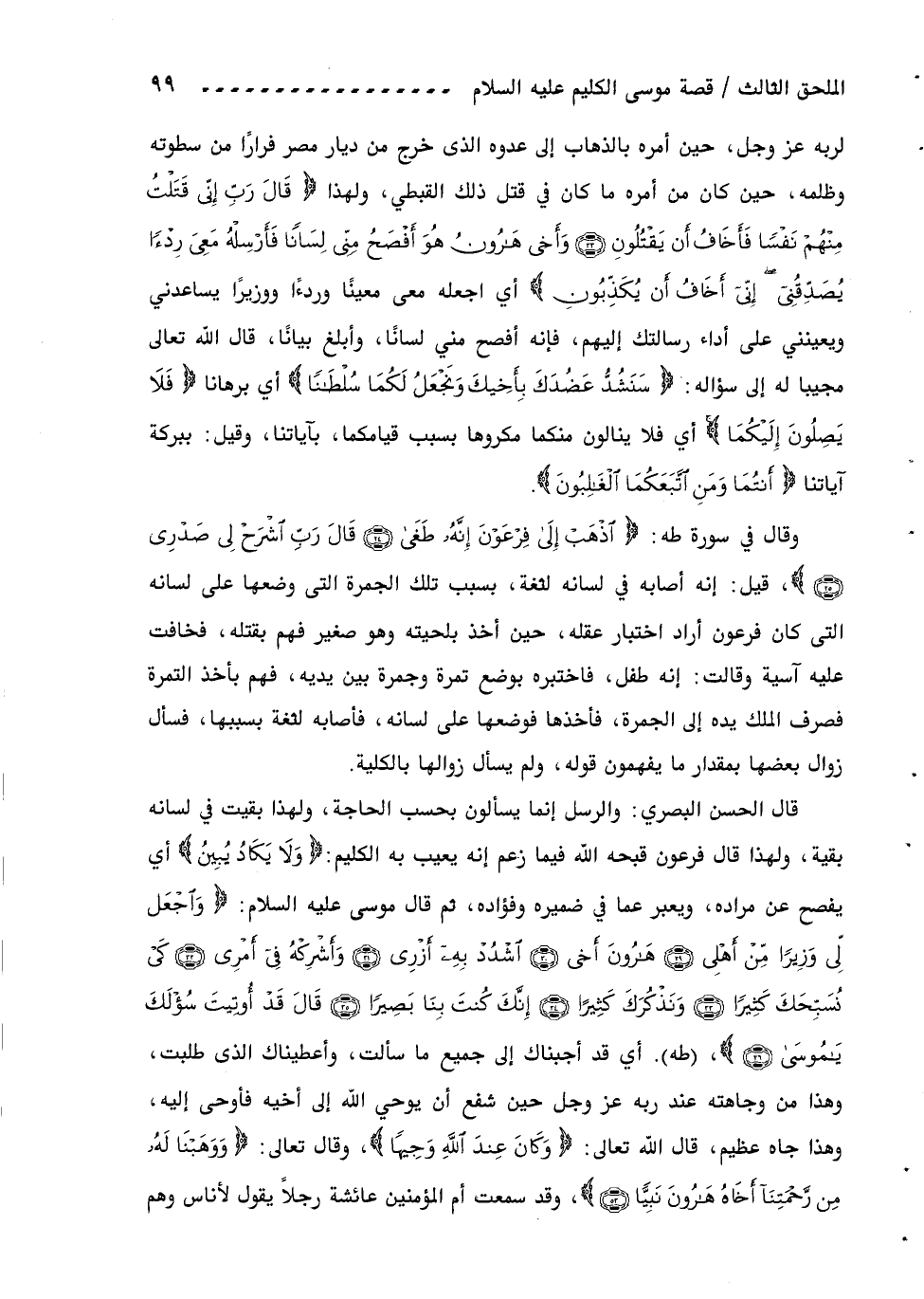 لربه عز وجل، حين أمره بالذهاب إلى عدوه الذى خرج من ديار مصر فرارا من سطوته وظلمه، حين كان من أمره ما كان في قتل ذلك القبطي، ولهذا قالَ رَبِّ إِنِّي قَتَلْتُ مِنْهُمْ نَفْساً فَأَخافُ أَنْ يَقْتُلُونِ (33) وأَخِي هارُونُ هُوَ أَفْصَحُ مِنِّي لِساناً فَأَرْسِلْهُ مَعِي رِدْءاً يُصَدِّقُنِي إِنِّي أَخافُ أَنْ يُكَذِّبُونِ أي اجعله معى معينا وردءا ووزيرا يساعدني ويعينني على أداء رسالتك إليهم، فإنه أفصح مني لسانا، وأبلغ بيانا، قال اللّه تعالى مجيبا له إلى سؤاله: سَنَشُدُّ عَضُدَكَ بِأَخِيكَ ونَجْعَلُ لَكُما سُلْطاناً أي برهانا فَلا يَصِلُونَ إِلَيْكُما أي فلا ينالون منكما مكروها بسبب قيامكما، بآياتنا، وقيل: ببركة آياتنا أَنْتُما ومَنِ اتَّبَعَكُمَا الْغالِبُونَ.