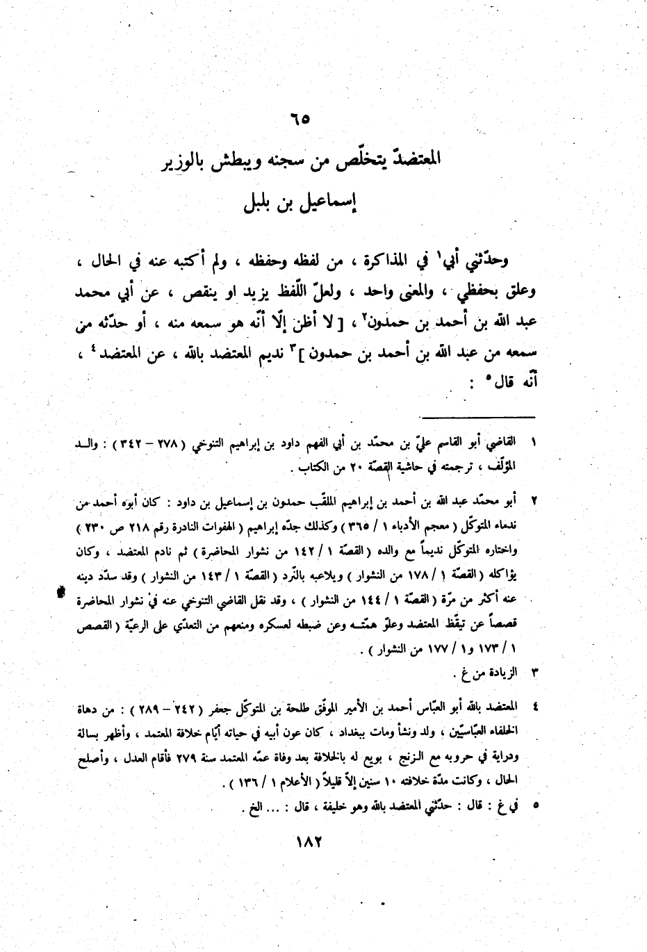 وحَدثني أبي فِي المذاكرة، من لَفظه وَحفظه، وَلم أكتبه عَنهُ فِي الْحَال، وعلق بحفظي، وَالْمعْنَى وَاحِد، وَلَعَلَّ اللَّفْظ يزِيد أَو ينقص، عَن أبي مُحَمَّد عبد الله بن أَحْمد بن حمدون، لَا أَظن إِلَّا أَنه هُوَ سَمعه مِنْهُ أَو حَدثهُ من سَمعه من عبد الله بن أَحْمد بن حمدون، نديم المعتضد بِاللَّه، عَن المعتضد، أَنه قَالَ: