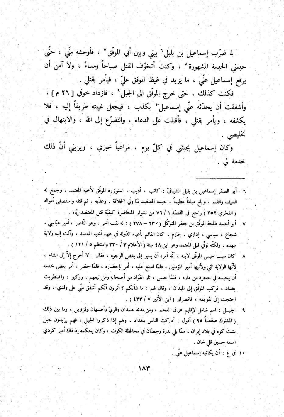 لما ضرب إِسْمَاعِيل بن بلبل بيني وَبَين أبي الْمُوفق، فأوحشه مني، حَتَّى حَبَسَنِي الحبسة الْمَشْهُورَة، وَكنت أَتَخَوَّف الْقَتْل صباحا وَمَسَاء، وَلَا آمن أَن يرفع إِسْمَاعِيل عني، مَا يزِيد فِي غيظ الْمُوفق عَليّ، فيأمر بقتلي.