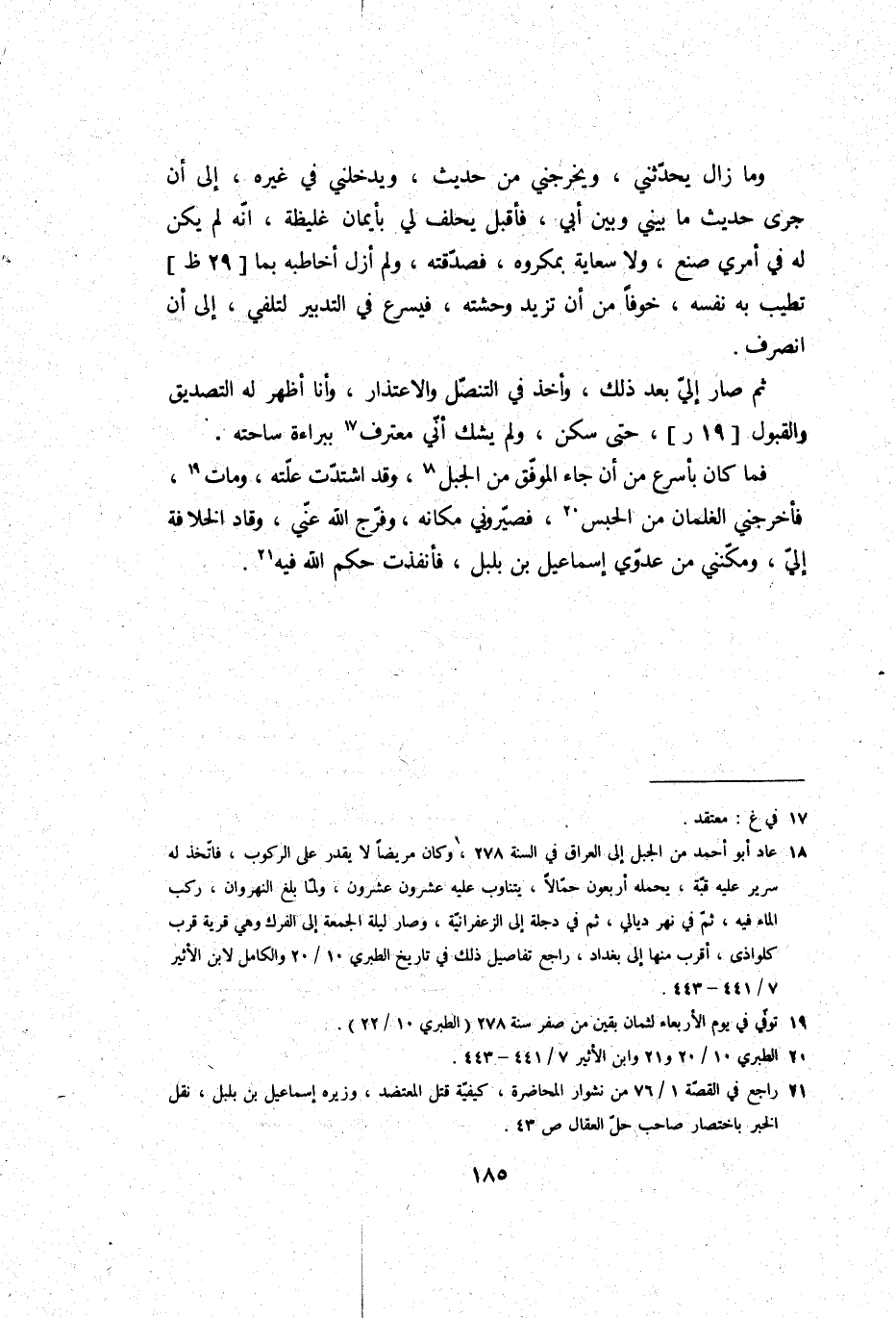 وَمَا زَالَ يحدثني، ويخرجني من حَدِيث، ويدخلني فِي غَيره، إِلَى أَن جرى حَدِيث مَا بيني وَبَين أبي، فَأقبل يحلف لي بأيمان غَلِيظَة، أَنه لم يكن لَهُ فِي أَمْرِي صنع، وَلَا سِعَايَة بمكروه، فصدقته، وَلم أزل أخاطبه بِمَا تطيب بِهِ نَفسه، خوفًا من أَن تزيد وحشته، فيسرع فِي التَّدْبِير لتلفي، إِلَى أَن انْصَرف.