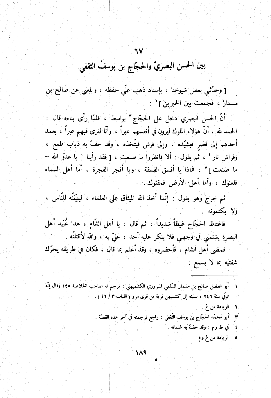 وحَدثني بعض شُيُوخنَا، بِإِسْنَاد ذهب عني حفظه، وَبَلغنِي عَن صَالح بن مِسْمَار، فَجمعت بَين الْخَبَرَيْنِ: أَن الْحسن الْبَصْرِيّ دخل على الْحجَّاج بواسط، فَلَمَّا رَأْي بناءه، قَالَ: الْحَمد لله، أَن هَؤُلَاءِ الْمُلُوك لَيرَوْنَ فِي أنفسهم عبرا، وَأَنا لنرى فيهم عبرا، يعمد أحدهم إِلَى قصر فيشيده، وَإِلَى فرش فيتخذه، وَقد حف بِهِ ذُبَاب طمع، وفراش نَار، ثمَّ يَقُول: أَلا فانظروا مَا صنعت، فقد رَأينَا، يَا عَدو الله، مَا صنعت، فَمَاذَا يَا أفسق الفسقة، وَيَا أفجر الفجرة، أما أهل السَّمَاء فلعنوك، وَأما أهل الأَرْض فمقتوك.