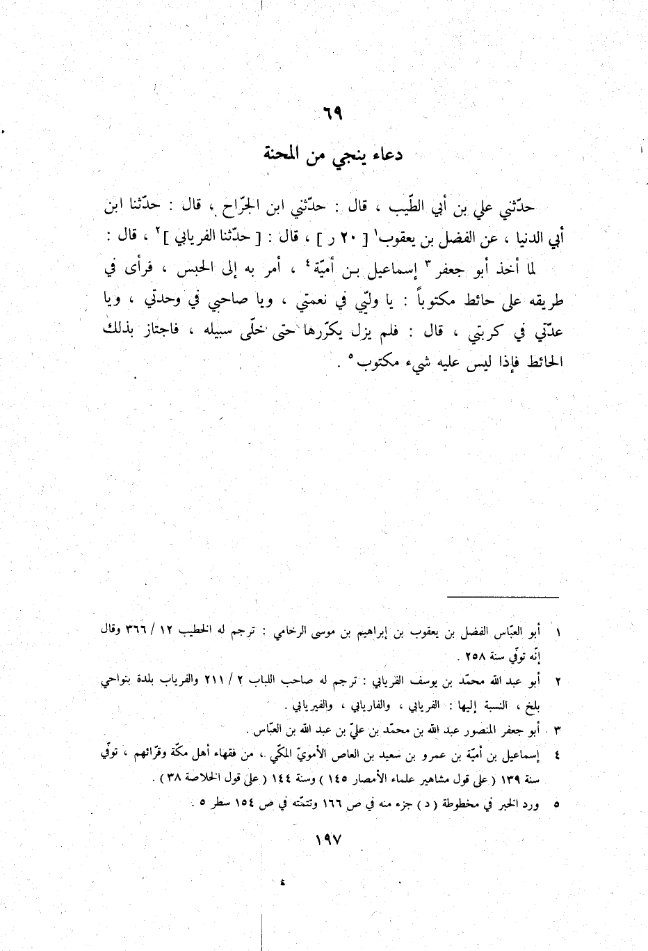 حَدثنِي عَليّ بن أبي الطّيب، قَالَ: حَدثنِي ابْن الْجراح، قَالَ: حَدَّثَنَا ابْن أبي الدُّنْيَا، عَن الْفضل بن يَعْقُوب، قَالَ: حَدَّثَنَا الْفرْيَابِيّ، قَالَ: لما أَخذ أَبُو جَعْفَر إِسْمَاعِيل بن أُميَّة، أَمر بِهِ إِلَى الْحَبْس، فَرَأى فِي طَرِيقه على حَائِط مَكْتُوبًا: يَا وليي فِي نعمتي، وَيَا صَاحِبي فِي وَحْدَتي، وَيَا عدتي فِي كربتي، قَالَ: فَلم يزل يكررها حَتَّى خلى سَبيله، فاجتاز بذلك الْحَائِط فَإِذا لَيْسَ عَلَيْهِ شَيْء مَكْتُوب 70