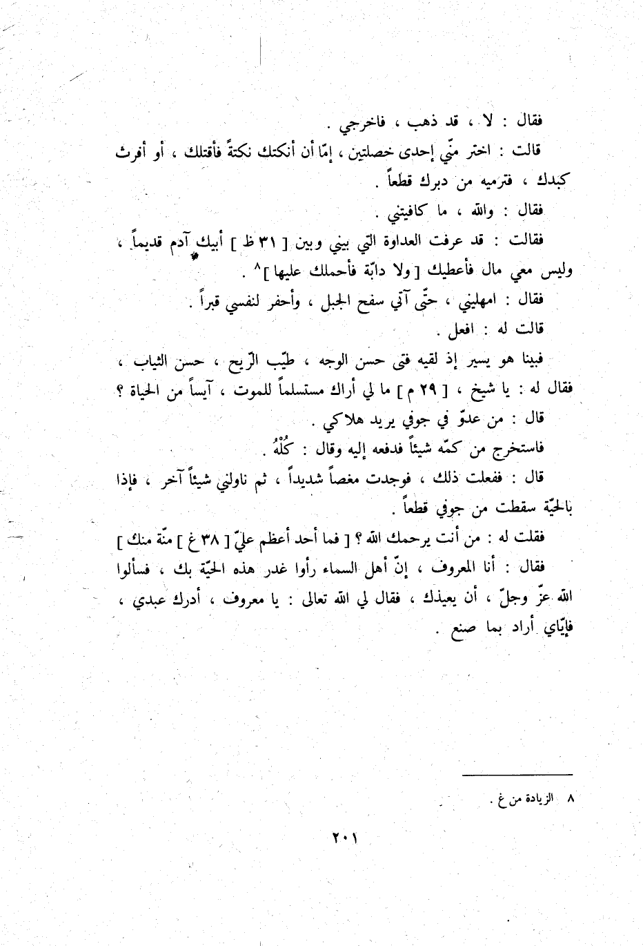 فَقلت لَهُ: من أَنْت يَرْحَمك الله؟ فَمَا أحد أعظم عَليّ منَّة مِنْك، فَقَالَ: أَنا الْمَعْرُوف، إِن أهل السَّمَاء رَأَوْا غدر هَذِه الْحَيَّة بك، فسألوا الله عز وَجل، أَن يعيذك، فَقَالَ لي الله تَعَالَى: يَا مَعْرُوف، أدْرك عَبدِي، فإياي أَرَادَ بِمَا صنع 71