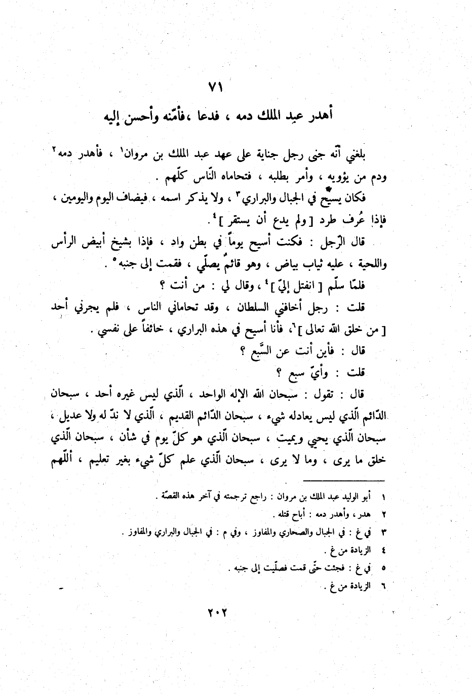 قَالَ الرجل: فَكنت أسيح يَوْمًا فِي بطن وَاد، فَإِذا بشيخ أَبيض الرَّأْس واللحية، عَلَيْهِ ثِيَاب بَيَاض، وَهُوَ قَائِم يُصَلِّي، فقنت إِلَى جنبه.