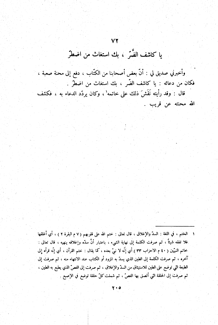 وَأَخْبرنِي صديق لي: أَن بعض أَصْحَابنَا من الْكتاب، دفع إِلَى محنة صعبة، فَكَانَ من دُعَائِهِ: يَا كاشف الضّر، بك اسْتَغَاثَ من اضْطر.