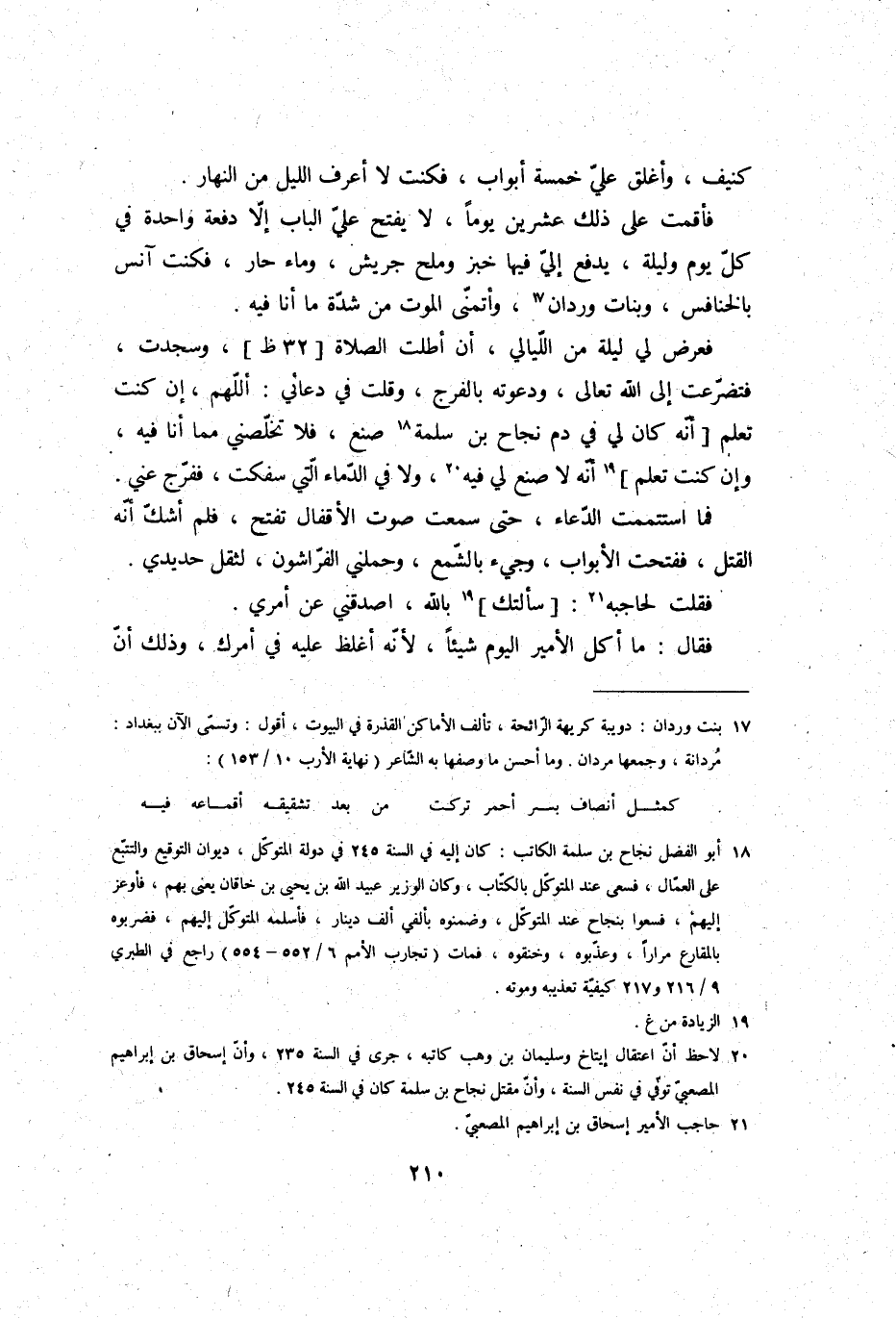 فَعرض لي لَيْلَة من اللَّيَالِي، أَن أطلت الصَّلَاة، وسجدت، فتضرعت إِلَى الله تَعَالَى، ودعوته بالفرج، وَقلت فِي دعائي: اللَّهُمَّ، إِن كنت تعلم أَنه كَانَ لي فِي دم نجاح بن سَلمَة صنع، فَلَا تخلصني مِمَّا أَنا فِيهِ، وَإِن كنت تعلم أَنه لَا صنع لي فِيهِ، وَلَا فِي الدِّمَاء الَّتِي سفكت، فَفرج عني.
