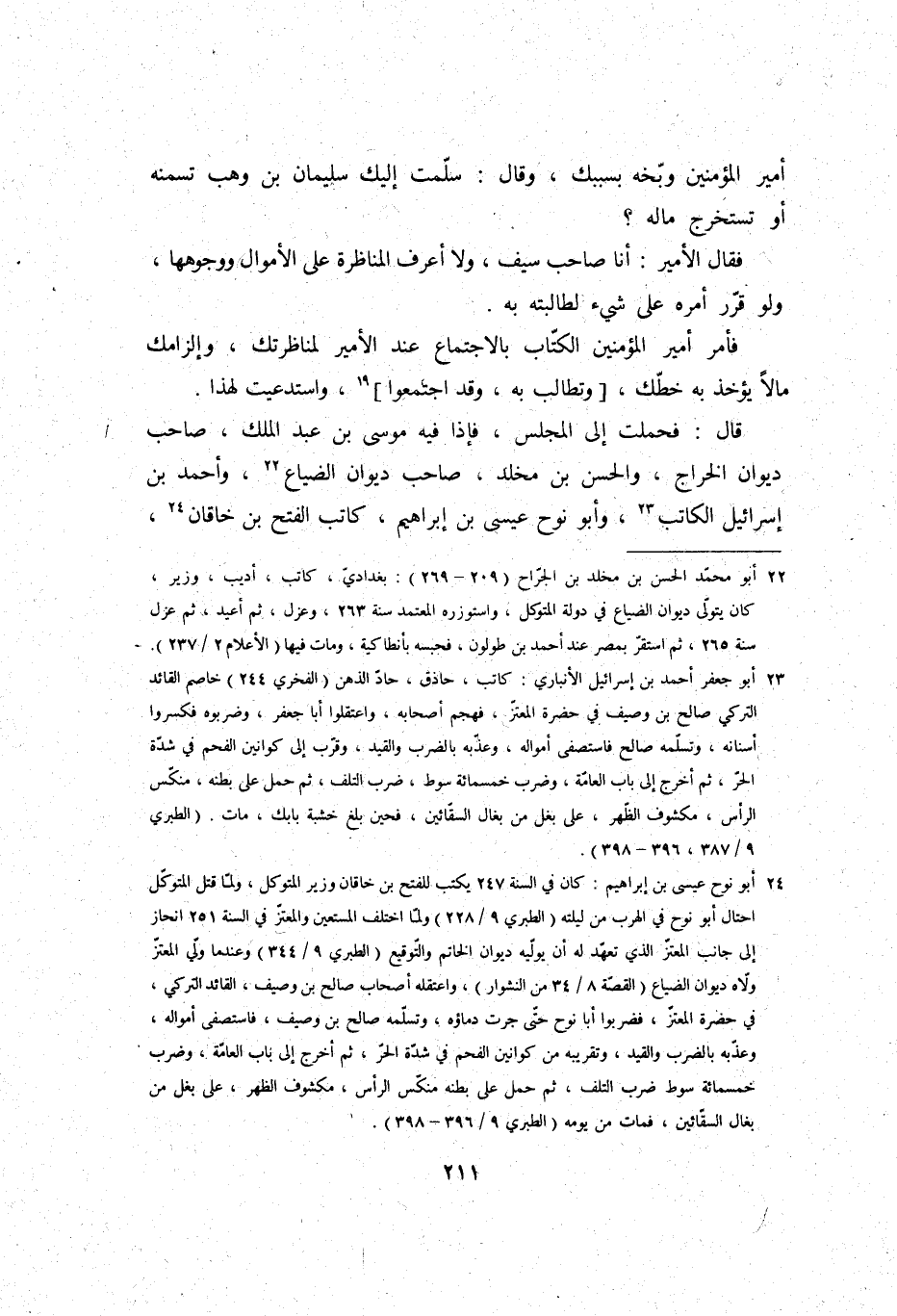 قَالَ: فَحملت إِلَى الْمجْلس، فَإِذا فِيهِ مُوسَى بن عبد الْملك، صَاحب ديوَان الْخراج، وَالْحسن بن مخلد، صَاحب ديوَان الضّيَاع، وَأحمد بن إِسْرَائِيل الْكَاتِب، وَأَبُو نوح عِيسَى بن إِبْرَاهِيم، كَاتب الْفَتْح بن خاقَان،