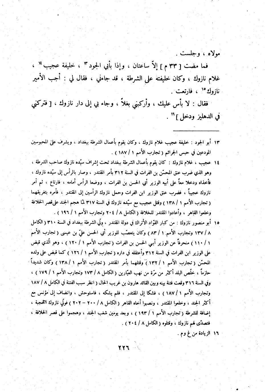 فَمَا مَضَت إِلَّا ساعتان، وَإِذا بِأبي الْجُود، خَليفَة عَجِيب، غُلَام نازوك، وَكَانَ خَلِيفَته على الشرطة، قد جَاءَنِي، فَقَالَ لي: أجب الْأَمِير نازوك، فارتعت.