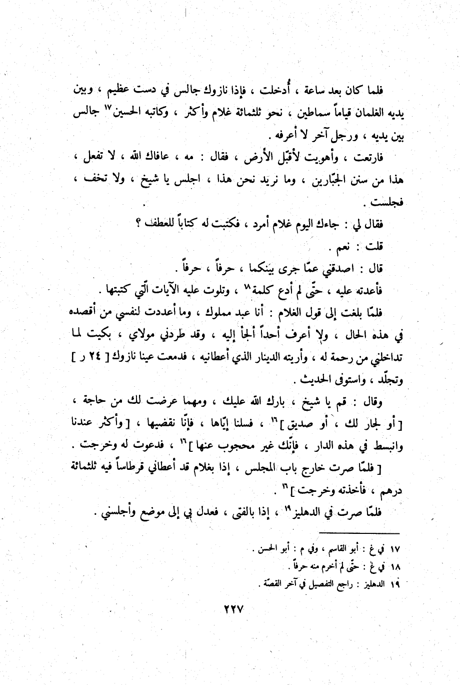 فَلَمَّا بلغت إِلَيّ قَول الْغُلَام: أَنا عبد مَمْلُوك، وَمَا أَعدَدْت لنَفْسي من أقصده فِي هَذِه الْحَال، وَلَا أعرف أحدا ألجأ إِلَيْهِ، وَقد طردني مولَايَ، بَكَيْت لما تداخلني من رَحْمَة لَهُ، وأريته الدِّينَار الَّذِي أعطانيه، فَدَمَعَتْ عينا نازوك وتجلد، وَاسْتوْفى الحَدِيث.