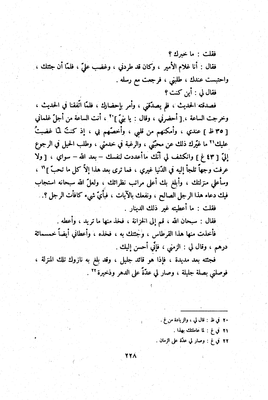 فَقَالَ لي: أَيْن كنت؟ فصدقته الحَدِيث، فَلم يصدقني، وَأمر بإحضارك، فَلَمَّا اتفقنا فِي الحَدِيث، وَخرجت السَّاعَة، أحضرني، وَقَالَ: يَا بني، أَنْت السَّاعَة من أجل غلماني عِنْدِي، وأمكنهم من قلبِي، وأخصهم بِي، إِذْ كنت لما غضِبت عَلَيْك مَا غَيْرك ذَلِك عَن محبتي، وَالرَّغْبَة فِي خدمتي، وَطلب الْحِيَل فِي الرُّجُوع إِلَيّ , وانكشف لي أَنَّك مَا أَعدَدْت لنَفسك، بعد الله، سواي، وَلَا عرفت وَجها تلجأ إِلَيْهِ فِي الدُّنْيَا غَيْرِي، فَمَا ترى بعد هَذَا إِلَّا كل مَا تحب، وسأعلي منزلتك، وأبلغ بك أَعلَى مَرَاتِب نظرائك، وَلَعَلَّ الله سُبْحَانَهُ اسْتَجَابَ فِيك دُعَاء هَذَا الرجل الصَّالح، ونفعك بِالْآيَاتِ، فَبِأَي شَيْء كافأت الرجل؟ .