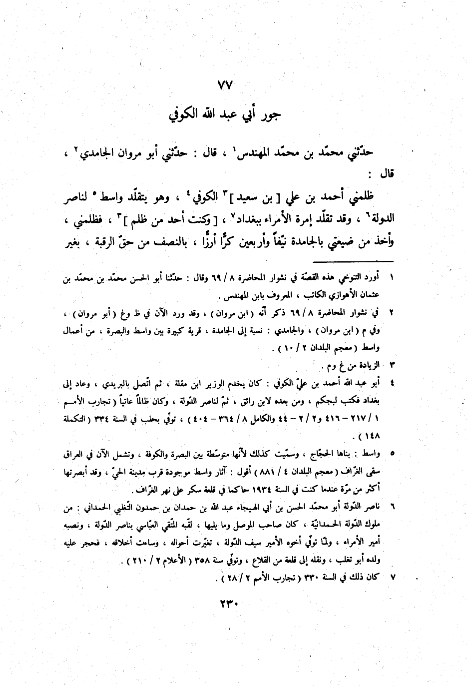 حَدثنِي مُحَمَّد بن مُحَمَّد المهندس، قَالَ: حَدثنِي أَبُو مَرْوَان الجامدي، قَالَ: ظَلَمَنِي أَحْمد بن عَليّ بن سعيد الْكُوفِي، وَهُوَ يتقلد وَاسِط لناصر الدولة، وَقد تقلد إمرة الْأُمَرَاء بِبَغْدَاد، وَكنت أحد من ظلم، فظلمني، وَأخذ من ضيعتي بالجامدة نيفا وَأَرْبَعين كرا أرزا، بِالنِّصْفِ من حق الرَّقَبَة، بِغَيْر
