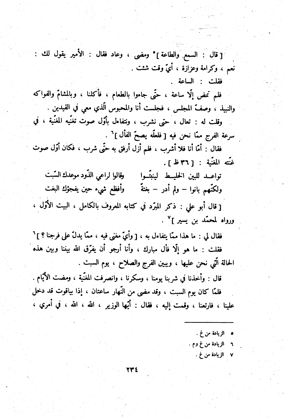 فَلم تمض إِلَّا سَاعَة، حَتَّى جَاءُوا بِالطَّعَامِ، فأكلنا، وبالمشام والفواكه والنبيذ، وصف الْمجْلس، فَجَلَست أَنا والمحبوس الَّذِي معي فِي القيدين.