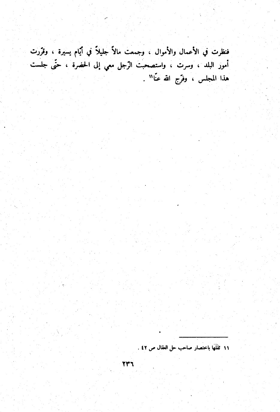 فَنَظَرت فِي الْأَعْمَال وَالْأَمْوَال، وجمعت مَالا جَلِيلًا فِي أَيَّام يسيرَة، وقررت أُمُور الْبَلَد، وسرت، واستصحبت الرجل معي إِلَى الحضرة، حَتَّى جَلَست هَذَا الْمجْلس، وَفرج الله عَنَّا.