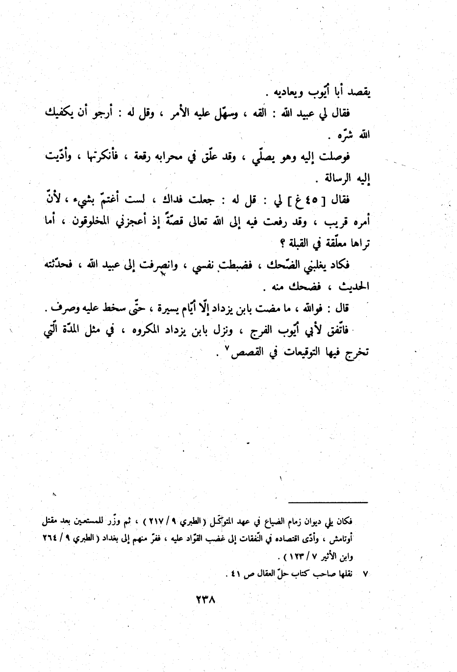 فَقَالَ لي: قل لَهُ: جعلت فدَاك، لست أغتم بِشَيْء، لِأَن أمره قريب، وَقد رفعت فِيهِ إِلَى الله تَعَالَى قصَّة إِذْ أعجزني المخلوقون، أما ترَاهَا معلقَة فِي الْقبْلَة؟ فكاد يغلبني الضحك، فضبطت نَفسِي، وانصرفت إِلَى عبيد الله، فَحَدَّثته الحَدِيث، فَضَحِك مِنْهُ.
