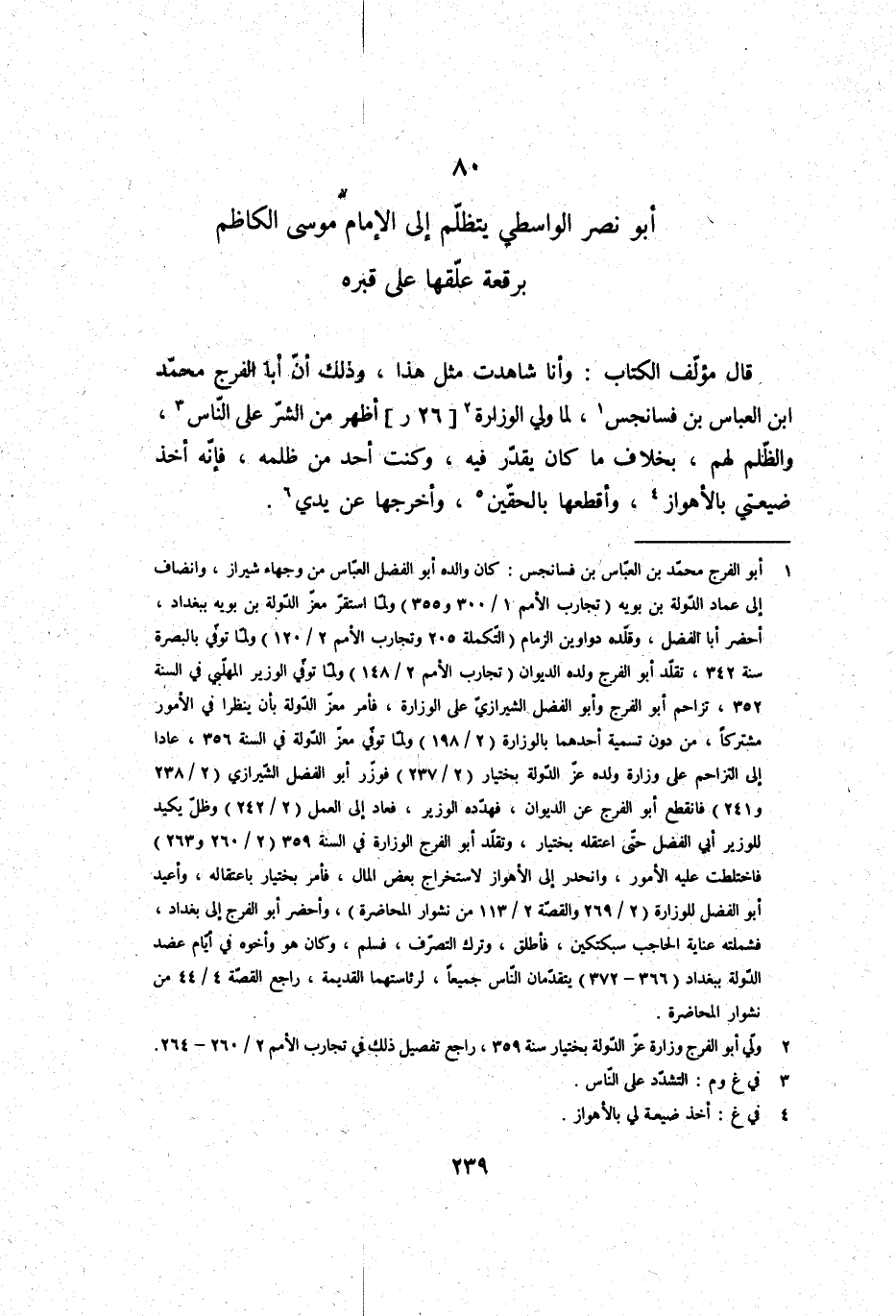 قَالَ: مؤلف الْكتاب: وَأَنا شاهدت مثل هَذَا، وَذَلِكَ أَن أَبَا الْفرج مُحَمَّد ابْن الْعَبَّاس بن فسانجس، لما ولي الوزارة أظهر من الشَّرّ على النَّاس، وَالظُّلم لَهُم، بِخِلَاف مَا كَانَ يقدر فِيهِ، وَكنت أحد من ظلمه، فَإِنَّهُ أَخذ ضيعتي بالأهواز، وأقطعها بالحقين، وأخرجها عَن يَدي.