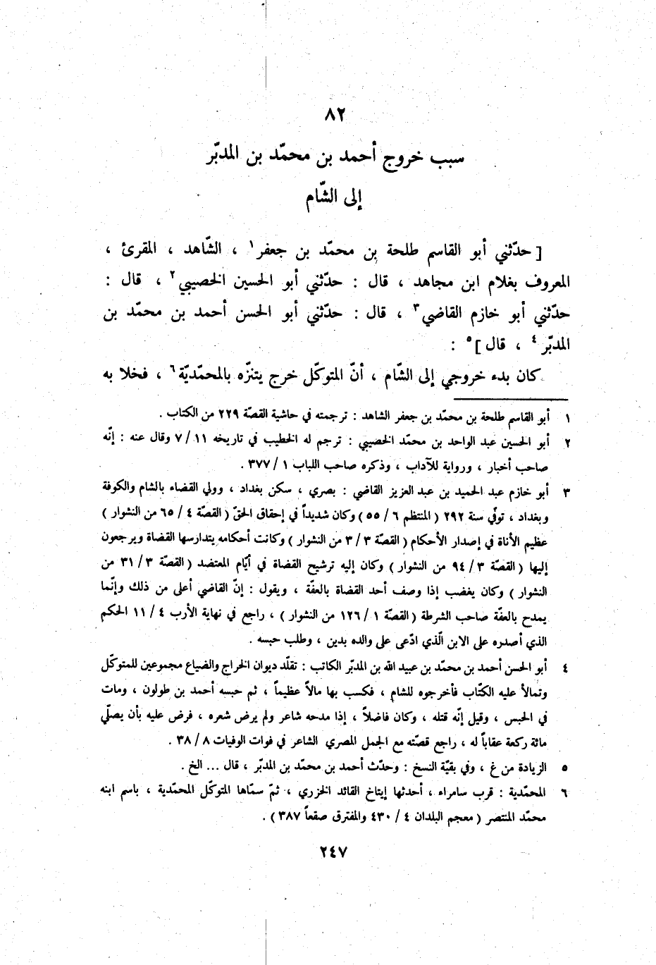 حَدثنِي أَبُو الْقَاسِم طَلْحَة بن مُحَمَّد بن جَعْفَر، الشَّاهِد، الْمُقْرِئ، الْمَعْرُوف بِغُلَام ابْن مُجَاهِد، قَالَ: حَدثنِي أَبُو الْحُسَيْن الخصيبي، قَالَ: حَدثنِي أَبُو خازم القَاضِي، قَالَ: حَدثنِي أَبُو الْحسن أَحْمد بن مُحَمَّد بن الْمُدبر، قَالَ: كَانَ بَدْء خروجي إِلَى الشَّام، أَن المتَوَكل خرج يتنزه بالمحمدية، فَخَلا بِهِ