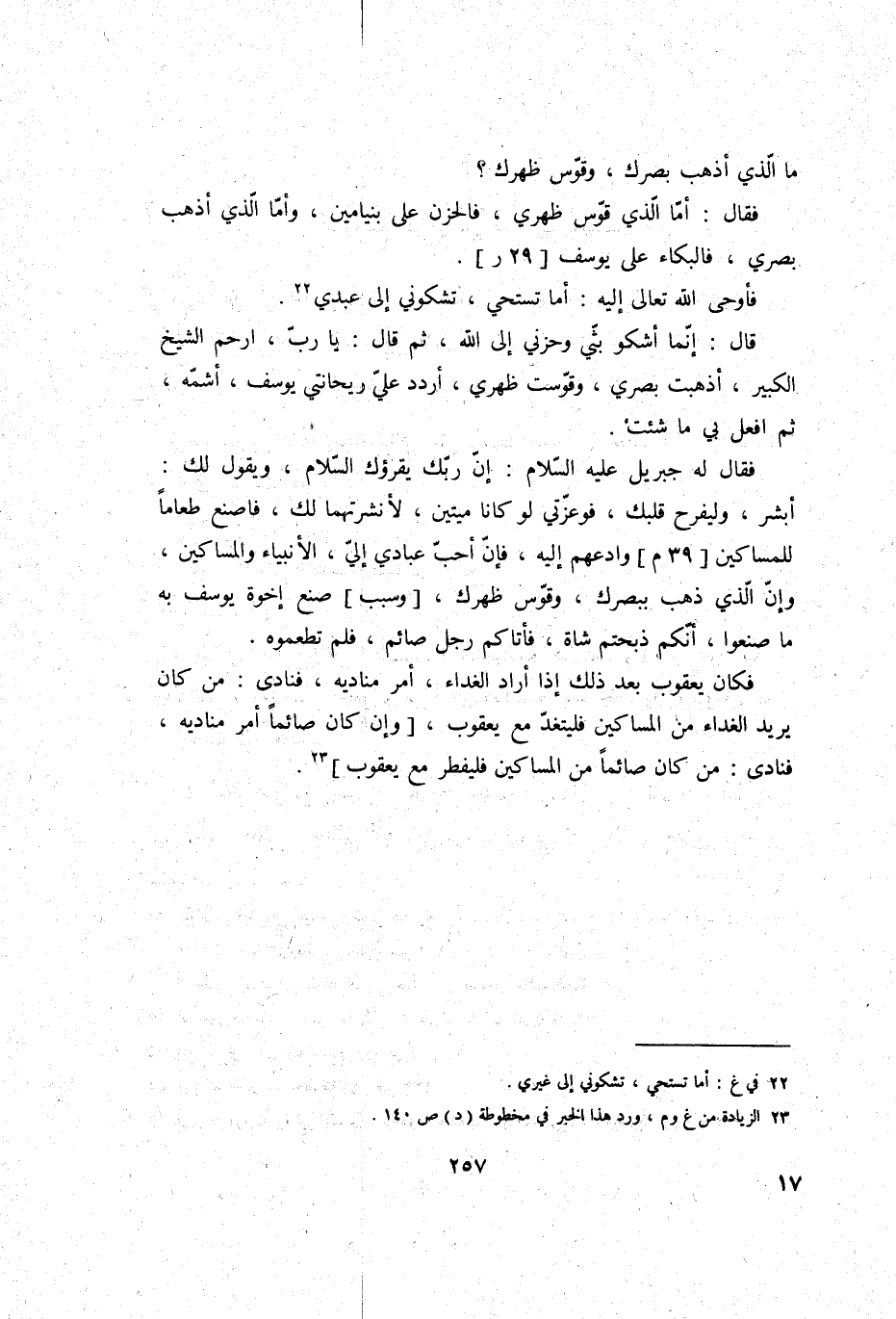 فَقَالَ لَهُ جِبْرِيلُ عَلَيْهِ السَّلامُ: إِنَّ رَبَّكَ يُقْرِؤُكَ السَّلامَ، وَيَقُولُ لَكَ: أَبْشِرْ، وَلْيَفْرَحْ قَلْبُكَ، فَوَعِزَّتِي لَوْ كَانَا مَيِّتَيْنِ، لأَنْشَرْتُهُمَا لَكَ، فَاصْنَعْ طَعَامًا لِلْمَسَاكِينِ وَادْعُهُمْ إِلَيْهِ، فَإِنَّ أَحَبُّ عِبَادِي إِلَيَّ، الأَنْبِيَاءَ وَالْمَسَاكِينَ، وَإِنَّ الَّذِي ذَهَبَ بِبَصَرِكَ، وَقَوَّسَ ظَهْرَكَ، وَسَبَّبَ صُنْعَ إِخْوَةِ يُوسُفَ بِهِ مَا صَنَعُوا، أَنَّكُمْ ذَبَحْتُمْ شَاةً، فَأَتَاكُمْ رَجُلٌ صَائِمٌ، فَلَمْ تُطْعِمُوهُ.