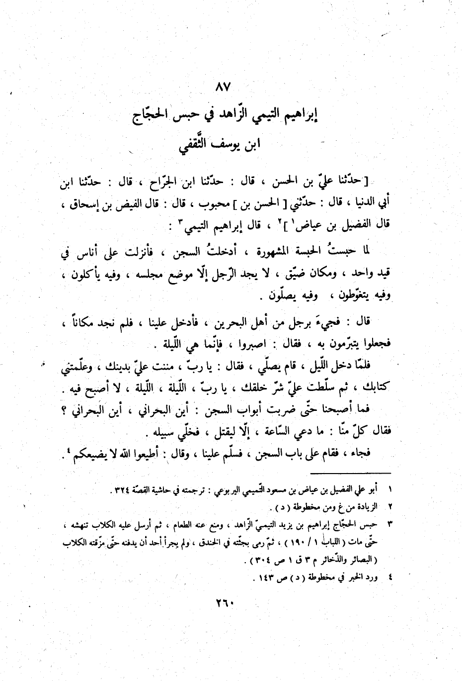 حَدَّثَنَا عَليّ بن الْحسن، قَالَ: حَدَّثَنَا ابْن الْجراح، قَالَ: حَدَّثَنَا ابْن أبي الدُّنْيَا، قَالَ: حَدثنِي الْحسن بن مَحْبُوب، قَالَ: قَالَ الْفَيْض بن إِسْحَاق، قَالَ: الفضيل بن عِيَاض، قَالَ إِبْرَاهِيم التَّيْمِيّ: لما حبست الحبسة الْمَشْهُورَة، أدخلت السجْن، فأنزلت على أنَاس فِي قيد وَاحِد، وَمَكَان ضيق، لَا يجد الرجل إِلَّا مَوضِع مَجْلِسه، وَفِيه يَأْكُلُون، وَفِيه يَتَغَوَّطُونَ، وَفِيه يصلونَ.