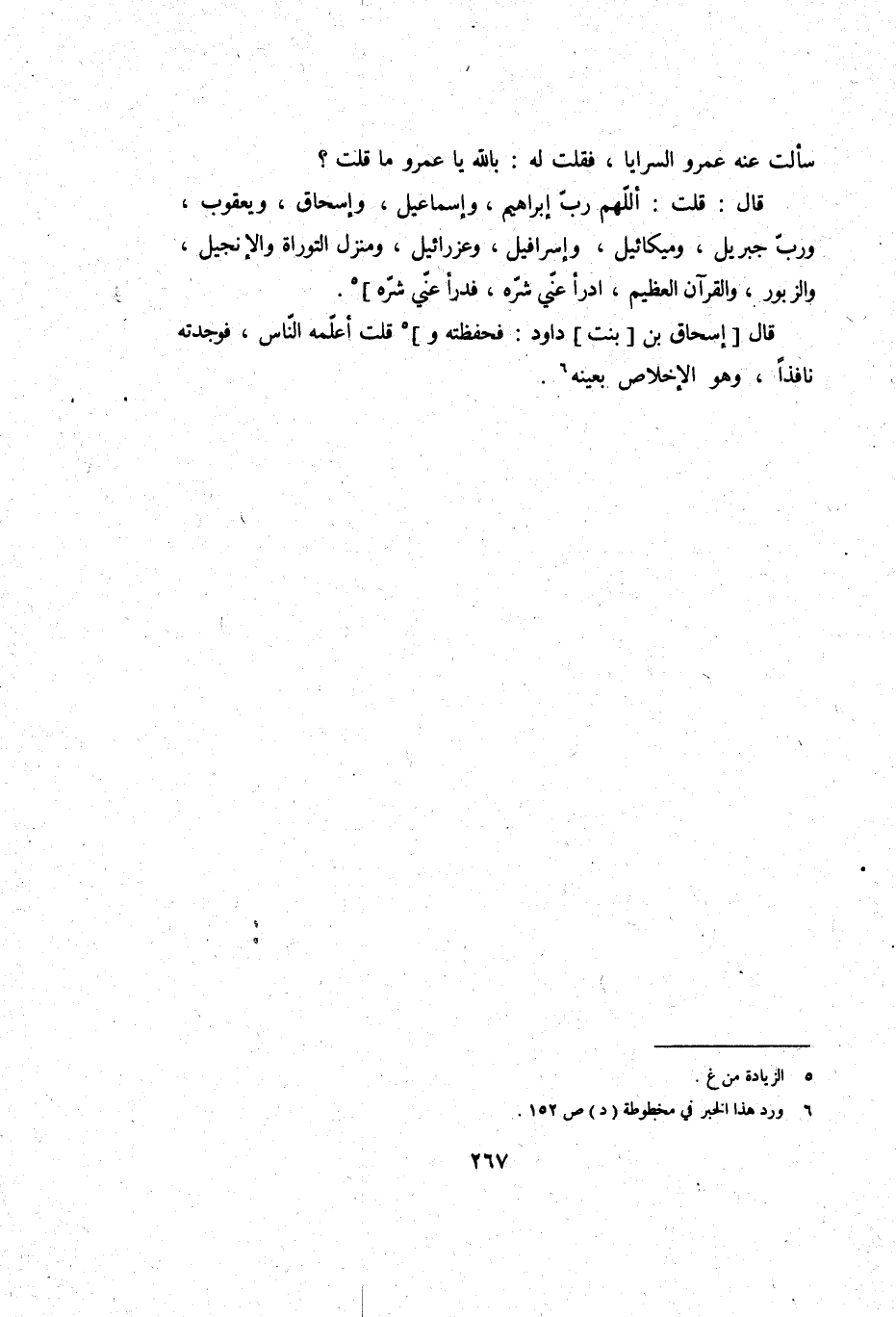 سَأَلت عَنهُ عَمْرو السَّرَايَا، فَقلت لَهُ: بِاللَّه يَا عَمْرو مَا قلت؟ قَالَ: قلت: اللَّهُمَّ رب إِبْرَاهِيم، وَإِسْمَاعِيل، وَإِسْحَاق، وَيَعْقُوب، وَرب جِبْرِيل، وَمِيكَائِيل، وإسرافيل، وعزرائيل، ومنزل التَّوْرَاة وَالْإِنْجِيل، وَالزَّبُور، وَالْقُرْآن الْعَظِيم، ادرأ عني شَره، فدرأ عني شَره.