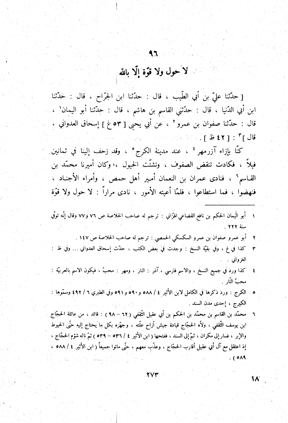 حَدَّثَنَا عَليّ بن أبي الطّيب، قَالَ: حَدَّثَنَا ابْن الْجراح، قَالَ: حَدَّثَنَا ابْن أبي الدُّنْيَا، قَالَ: حَدثنِي الْقَاسِم بن هَاشم، قَالَ: حَدَّثَنَا أَبُو الْيَمَان، قَالَ: حَدَّثَنَا صَفْوَان بن عَمْرو، عَن أبي يحيى إِسْحَاق العدواني، قَالَ: كُنَّا بِإِزَاءِ آزرمهر، عِنْد مَدِينَة الكرج، وَقد زحف إِلَيْنَا فِي ثَمَانِينَ فيلا، فَكَادَتْ تنقض الصُّفُوف، وتشتت الْخُيُول، وَكَانَ أميرنا مُحَمَّد بن الْقَاسِم، فَنَادَى عمرَان بن النُّعْمَان أَمِير أهل حمص، وأمراء الأجناد، فنهضوا، فَمَا اسْتَطَاعُوا، فَلَمَّا أعيته الْأُمُور، نَادَى مرَارًا: لَا حول وَلَا قُوَّة