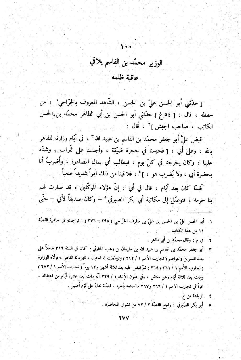 حَدثنِي أَبُو الْحسن عَليّ بن الْحسن، الشَّاهِد الْمَعْرُوف بالجراحي، من حفظه، قَالَ: حَدثنِي أَبُو الْحسن بن أبي الطَّاهِر مُحَمَّد بن الْحسن الْكَاتِب، صَاحب الْجَيْش، قَالَ: قبض عَليّ أَبُو جَعْفَر مُحَمَّد بن الْقَاسِم بن عبيد الله، فِي أَيَّام وزارته للقاهر بِاللَّه، وعَلى أبي، فحبسنا فِي حجرَة ضيقَة، وأجلسنا على التُّرَاب، وشدد علينا، وَكَانَ يخرجنا فِي كل يَوْم، فَيُطَالب أبي بِمَال المصادرة، وأضرب أَنا بِحَضْرَة أبي، وَلَا يضْرب هُوَ، فلاقينا من ذَلِك أمرا شَدِيدا صعبا.