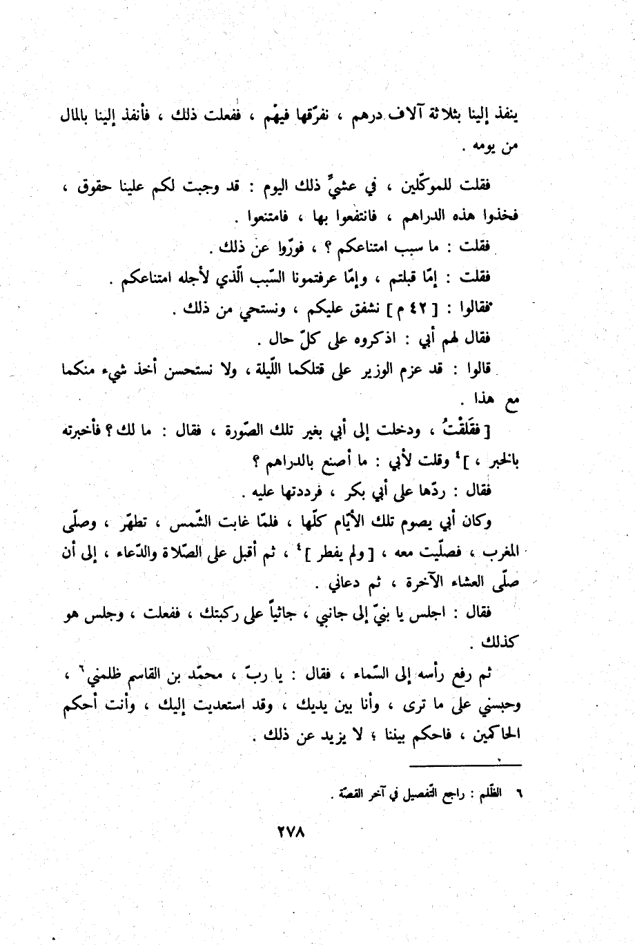 ثمَّ رفع رَأسه إِلَى السَّمَاء، فَقَالَ: يَا رب، مُحَمَّد بن الْقَاسِم ظَلَمَنِي وحبسني على مَا ترى، وَأَنا بَين يَديك، وَقد استعديت إِلَيْك، وَأَنت أحكم الْحَاكِمين، فاحكم بَيْننَا، لَا يزِيد عَن ذَلِك.